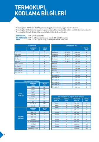 TERMOKUPLKODLAMA B%u0130LG%u0130LER%u0130%u2022 Termokupllar -200%u00b0C%u2019den 2320%u00b0C%u2019ye kadar de%u011fi%u015fik proseslerde yayg%u0131n olarak kullan%u0131l%u0131r.%u2022 Termokupllar iki farkl%u0131 metal ala%u015f%u0131m%u0131n u%u00e7lar%u0131n%u0131n kaynaklanmas%u0131 ile elde edilen s%u0131cakl%u0131k %u00f6l%u00e7%u00fc elemanlar%u0131d%u0131r. %u2022 Termokupllar ile ilgili detayl%u0131 bilgi genel bilgiler b%u00f6l%u00fcm%u00fcnde verilmi%u015ftir.TERMOKUPL: DIN 43710 ve IEC 584DI%u015e KORUYUCU: DIN ve AISI standartlar%u0131nda metal, DIN 40685 SeramikKAFA: DIN 43729 A tipi ve B tipi Al%u00fcminyum d%u00f6k%u00fcm kafa, IP67ELEMANLARSTANDARTKODUTETC%u0130SKODUCu-KonstUUCu-KonstTTFe-KonstLLFe-KonstJJNiCr-NiKKNikrosil-NisilNNCr-KonstEEPt%10Rh-PtSSPt%13Rh-PtRRPt%18Rh-PtBBELEMAN %u00c7APLARITETC%u0130SKODUCu-Konst(U ve T)0,50 mm5Cu-Konst(U ve T)1,00 mm1Fe-Konst(L ve J)0,50 mm5Fe-Konst(L ve J)1,00 mm1Fe-Konst(L ve J)2,00 mm2N%u0130Cr-N%u01301,00 mm1NiCr-Ni1,50 mm4NiCr-Ni2,00 mm2NiCr-Ni3,00 mm3Nikrosil-Nisil3,00 mm3Pt%10Rh-Pt0,35 mm6Pt%10Rh-Pt0,50 mm5Pt%13Rh-Pt0,35 mm6Pt%13Rh-Pt0,50 mm5Pt%18Rh-Pt0,35 mm6Pt%18Rh-Pt0,50 mm5DI%u015e KORUYUCU KILIFLARMETALKILIFLARSTANDARTKODUTETC%u0130SKODU1.4301M11.4541M21.4571M31.4749M41.4841M5INCONEL-600M6C-2M7ALLOY-25M8GG-22M9SERAM%u0130KKILIFLARSTANDARTKODUTETC%u0130SKODUKER-610S1KER-799S2KER-530S3QUARTZS4S%u0130L%u0130KON-KARBAYTS5REFRAXS6GRAF%u0130TS7KARBON %u00c7EL%u0130%u011e%u0130S8DI%u015e KORUYUCU KILIF %u00c7APLARI VE BOYLARISTANDART%u00c7APLARTETC%u0130SKODUSTANDARTBOYLARTETC%u0130SKODU6 mm06100 mm108 mm08160 mm169 mm09200 mm2011 mm11230 mm2314 mm14250 mm2515 mm15300 mm3022 mm22400 mm4024 mm24500 mm5026 mm26710 mm7130 mm301000 mm10045 mm451200 mm1201500 mm15010