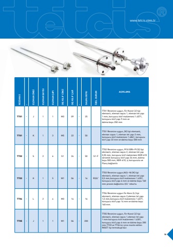 RES%u0130M NO-ELEMAN C%u0130NS%u0130ELEMAN SAYISIELEMAN %u00c7APIDI%u015e KILIF C%u0130NC%u0130DI%u015e KILIF %u00c7API-DALMA BOYU%u00d6ZEL DURUMA%u00c7IKLAMATT01J11M30925TT01 Resmine uygun, Fe-Konst (J) tipi elemanl%u0131, eleman say%u0131s%u0131 1, eleman tel %u00e7ap%u0131 1 mm, koruyucu k%u0131l%u0131f malzemesi 1.4571, koruyucu k%u0131l%u0131f %u00e7ap%u0131 9 mm vedalma boyu 250 mmTT01K13M52250TT01 Resmine uygun, (K) tipi elemanl%u0131,eleman say%u0131s%u0131 1, eleman tel %u00e7ap%u0131 3 mm,koruyucu k%u0131l%u0131f malzemesi 1.4841, koruyucu k%u0131l%u0131f %u00e7ap%u0131 22 mm ve dalma boyu 500 mmTT02-S26S124-50S1-FTT02 Resmine uygun, Pt%10Rh-Pt (S) tipielemanl%u0131, eleman say%u0131s%u0131 2, eleman tel %u00e7ap 0,35 mm, koruyucu k%u0131l%u0131f malzemesi KER-610 seramik koruyucu k%u0131l%u0131f %u00e7ap%u0131 24 mm, dalma boyu 500 mm, KER-610, i%u00e7 koruyuculu ve Flan%u015f ba%u011flant%u0131l%u0131TT03-K15M106-16R3/4%u201dTT03 Resmine uygun,NiCr-Ni (K) tipi elemanl%u0131, eleman say%u0131s%u0131 1, eleman tel %u00e7ap%u0131 0,5 mm,koruyucu k%u0131l%u0131f malzemesi 1.4301, koruyucu k%u0131l%u0131f %u00e7ap%u0131 6 mm ve dalma boyu 160 mm proses ba%u011flant%u0131s%u0131 3/4%u201d rekorluTT04L24M31416TT04 Resmine uygun Fe-Kons (L) tipi elemanl%u0131, eleman say%u0131s%u0131 2,eleman tel %u00e7ap%u0131 1,5 mm,koruyucu k%u0131l%u0131f malzemesi 1.4571, koruyucu k%u0131l%u0131f %u00e7ap%u0131 14 mm ve dalma boyu 160 mm.TT05-J11M106-200TT05 Resmine uygun, Fe-Konst (J) tipielemanl%u0131, eleman say%u0131s%u0131 1,eleman tel %u00e7ap%u0131 1 mm koruyucu k%u0131l%u0131f malzemesi 1.4301, koruyucu k%u0131l%u0131f %u00e7ap%u0131 6 mm ve dalma boyu 200 mm.TT03 ve TT04%u2019%u00fcn i%u00e7ine monte edilen %u0130NSET tip termokupl%u2019dur.15www.tetcis.com.tr
