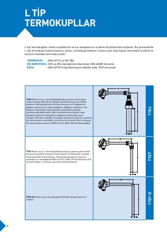 L T%u0130PTERMOKUPLLARL tipi termokupllar metal eriyiklerinin ve tuz banyolar%u0131n%u0131n s%u0131cakl%u0131k %u00f6l%u00e7%u00fcmlerinde kullan%u0131l%u0131r. Bu proseslerde L tipi termokupl kullan%u0131lmas%u0131n%u0131n amac%u0131, termokupl kafas%u0131n%u0131 ortama a%u00e7%u0131k olan banyo %u00fczerindeki s%u0131cakl%u0131k ve korozif ortamdan korumak i%u00e7indir.TERMOKUPL: DIN 43710 ve IEC 584DI%u015e KORUYUCU: DIN ve AISI standartlar%u0131nda metal, DIN 40685 SeramikKAFA: DIN 43729 A tipi Al%u00fcminyum d%u00f6k%u00fcm kafa. IP67 korumal%u0131TT06 Resim no%u2019lu L tipi termokupllarda prosesin cinsine g%u00f6re silikon karbayt (S5) refrax (S6) gibi seramik koruyuculu k%u0131l%u0131flarkullan%u0131l%u0131r. Montaj%u0131nda kal%u0131n etli olan koruyucu k%u0131l%u0131f sa%u011flam bir ba%u011flant%u0131 par%u00e7as%u0131 ile L2 ba%u015f%u0131na ba%u011flan%u0131r. Ba%u011flant%u0131 noktas%u0131n%u0131n Tuz banyosu veya metal eriyik potas%u0131n%u0131n y%u00fczeyinden yukardatutulmas%u0131nda fayda vard%u0131r. Aksi durumda korozif gazlar veyay%u00fcksek s%u0131cakl%u0131k termokuplla bu ba%u011flant%u0131 noktas%u0131ndan zararverebilir. Standart imalatta termokupl eleman%u0131n%u0131n %u00f6mr%u00fcn%u00fc uzatmak i%u00e7in d%u0131%u015f koruyucu serami%u011fin i%u00e7ine ikinci bir seramik t%u00fcp i%u00e7 koruyucu (Primer) olarak kulan%u0131l%u0131r. (KER-610 (S1) KER-799 Saf Al%u00fcmina(S2)TT06TT07 Resim no%u2019lu L termokupllarda prosesin yap%u0131s%u0131na g%u00f6re metal koruyuculu k%u0131l%u0131flar kullan%u0131l%u0131r. Genel olarak Tuz banyolar%u0131 ve metal eriyik proseslerinde kullan%u0131l%u0131r. Termokupl eleman%u0131n%u0131n %u00f6mr%u00fcn%u00fc uzatmak i%u00e7in istendi%u011finde KER-610 (S1), KER-799 Saf Al%u00fcmina (S2) seramik t%u00fcpler i%u00e7 koruyucu (primer) olarak kullan%u0131l%u0131r.TT07TT07-D Resim no%u2019lu LtermokupllunTT07%u2019den fark%u0131dirseksiz olmas%u0131d%u0131r.TT07-D16
