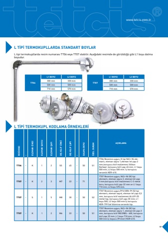 L T%u0130P%u0130 TERMOKUPLLARDA STANDART BOYLARL tipi termokupllarda resim numaras%u0131 TT06 veya TT07 olabilir. A%u015fa%u011f%u0131daki resimde de g%u00f6r%u00fcld%u00fc%u011f%u00fc gibi L1 boyu dalma boyudur.TT06L1 BOYUL2 BOYU300 mm330 mm500 mm500 mm710 mm570 mmTT07L1 BOYUL2 BOYU300 mm330 mm500 mm500 mm710 mm570 mmRES%u0130M NO-ELEMAN C%u0130NS%u0130ELEMAN SAYISIELEMAN %u00c7APIDI%u015e KILIF C%u0130NC%u0130DI%u015e KILIF %u00c7API-DALMA BOYU%u00d6ZEL DURUMA%u00c7IKLAMATT06-K12S545-50S1TT06 Resmine uygun, K tipi NiCr-Ni elemanl%u0131, eleman say%u0131s%u0131 1,eleman tel %u00e7ap%u0131 2 mm,koruyucu k%u0131l%u0131f malzemesi SilikonKarbayt, koruyucu k%u0131l%u0131f %u00e7ap%u0131 45 mm, L1 boyu 500 mm, L2 boyu 500 mm. %u0130%u00e7 koruyucuseramik KER-610.TT07K23M72271TT07 Resmine uygun, NiCr-Ni (K) tipi elemanl%u0131, eleman say%u0131s%u0131 2, eleman tel %u00e7ap%u0131 3 mm,koruyucu k%u0131l%u0131f malzemesi C-2 metal boru, koruyucu k%u0131l%u0131f %u00e7ap%u0131 22 mm ve L1 boyu 710 mm, L2 boyu 570 mm.TT07-S15M830-50S2TT07 Resmine uygun,Pt%10Rh-Pt (S) tipi elemanl%u0131, eleman say%u0131sl, eleman tel %u00e7ap%u0131 0,5 mm, koruyucu k%u0131l%u0131f malzemesi ALLOY-25 metal t%u00fcp, koruyucu k%u0131l%u0131f %u00e7ap%u0131 30 mm, L1 boyu 500, L2 boyu 500 mm.%u0130%u00e7 koruyucuKER-799 Saf Al%u00fcmina seramik t%u00fcp.TT07-K12M622-50S1TT07 Resmine uygun, NiCr-Ni (K) tipi elemanl%u0131, eleman say%u0131s%u0131 1, eleman tel %u00e7ap%u0131 2 mm, koruyucu k%u0131l%u0131f INCONEL- 600, koruyucu k%u0131l%u0131f %u00e7ap%u0131 22 mm ,L1 boyu 710 mm, L2 boyu 500 mm.%u0130%u00e7 koyucu (Primer) KER-610.17www.tetcis.com.trL T%u0130P%u0130 TERMOKUPL KODLAMA %u00d6RNEKLER%u0130