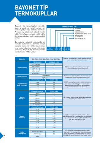 BAYONET T%u0130PTERMOKUPLLARBayonet tip termokupllar genelde basit proseslerde tercih edilen bir termokupldur. Sabit kablolu %u00fcretimdir. Prosese yay s%u0131k%u0131%u015ft%u0131rmal%u0131 olarak monte edilir. Termokupl, ucundaki metal kablo ile s%u0131k%u0131%u015ft%u0131rd%u0131%u011f%u0131ndan s%u0131zd%u0131rmazl%u0131k %u00f6zelli%u011fi yoktur.Bu nedenle rutubetli ortamlarda ve s%u0131v%u0131larda kullan%u0131lmaz. Genelde metal bloklara a%u00e7%u0131lan bir deli%u011fe dald%u0131r%u0131larak veya metal y%u00fczeyine temas ettirilerek kullan%u0131l%u0131r. Bayonet tip termokupllarda standart rekor M12 x 1,5%u2019dur.TERMOKUPL KODLAMATB01 J 1 06 3 - 1K R1Resim No - A B CC - D - EE FFRES%u0130M NOELEMANELEMAN SAYISIDI%u015e KORUYUCU KILIF %u00c7APIDALMA BOYUKABLO BOYU%u00d6ZEL DURUMLARRES%u0130M NOTB01, TB02, TB03, TB04, TB05, TB06, TB07, TB08Bayonet termokupllar%u0131n imalat %u015fekilleri de%u011fi%u015fik resim numaralar%u0131 ile belirlenmi%u015ftir.ELEMAN SINIFITETC%u0130S KODUSTANDART KODU(A) Hanesine termokupllar%u0131n cinsine g%u00f6reo elemana kar%u015f%u0131l%u0131k gelen harf yaz%u0131l%u0131r.U (Cu-Konst)UT (Cu-Konst)TL ( Fe-Konst)LJ (Fe-Konst) JK ( NiCr-Ni )KELEMAN SAYISI1 Tek eleman(B) Hanesine termokupllar%u0131n tek elemanl%u0131 veya 2 %u00c7ift eleman%u00e7ift elemanl%u0131 olmas%u0131na g%u00f6re 1 veya 2 yaz%u0131l%u0131r.DI%u015e KORUYUCU KILIF %u00c7API (mm)STANDART %u00c7APLARTETC%u0130S KODU(CC) Proses %u015fartlar%u0131na g%u00f6re se%u00e7ilen koruyucu k%u0131l%u0131f %u00e7aplar%u0131na kar%u015f%u0131l%u0131k gelen say%u0131lar yaz%u0131l%u0131r.Bayonet tip termokupllarda koruyucu k%u0131l%u0131f paslanmaz olarak verilir (iki hane).4 mm045 mm056 mm068 mm08DALMABOYU(cm)STANDART BOYLARTETC%u0130S KODU(D) Prosese uygun olarak se%u00e7ilen dalma boyuna kar%u015f%u0131l%u0131k gelen say%u0131lar yaz%u0131l%u0131r.10 mm120 mm230 mm350 mm5100 mm10ve di%u011fer boylar...KABLOBOYU(mt)STANDART BOYLARTETC%u0130S KODU(EE) Hanesine termokupl ka%u00e7 metre kablolu olarak isteniyor ise o kablo boyuna kar%u015f%u0131l%u0131k gelen say%u0131 ve harf yaz%u0131l%u0131r. %u00d6rne%u011fin; 1K = 1 mt. Kablolu gibi. 8K = 8 mt. Kablolu gibi.1.0 mt1,0K1.5 mt1,5K2.0 mt2,OK2.5 mt2,5K3.0 mt3,OK3.5 mt3,5K4.0 mt4,OK4.5 mt4,5K5.0 mt5,OK%u00d6ZELDURUMLAR(FF) Hanesine termokuplda standart rekor olan M12 x 1,5 d%u0131%u015f%u0131nda rekor istendi%u011finde veya standart imalat%u0131n d%u0131%u015f%u0131nda herhangi bir %u00f6zellik istendi%u011finde yanda belirtilmi%u015f olan kodlar yaz%u0131l%u0131r.REKOR M12x 1,75R1REKOR 1/4R2%u00d6ZEL20