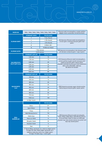 RES%u0130M NOTM01, TM02, TM03, TM04, TM05, TM06, TM07, TM08Mineral izoleli termokupllar%u0131n imalat %u015fekilleri de%u011fi%u015fik resim numaralar%u0131 ile belirlenmi%u015ftir.ELEMAN SINIFISTANDART KODUTETC%u0130S KODU(A) Hanesine Mineral izoleli termokupllar%u0131ncinsine g%u00f6re o elemana kar%u015f%u0131l%u0131k gelen harf yaz%u0131l%u0131r.TT (Cu-Konst) LL (Fe-Konst)JJ (Fe-Konst) KK (NiCr-N%u0130 )NN (Nikrosil-Nisil)ELEMAN SAYISI1 Tek eleman(B) Hanesine termokupllar%u0131n tek elemanl%u0131 veya %u00e7ift elemanl%u0131 olmas%u0131na g%u00f6re 1 veya 2 yaz%u0131l%u0131r.2 %u00c7ift elemanDI%u015e KORUYUCUKILIF %u00c7API (mm)STANDART %u00c7APLARTETC%u0130S KODU(CC) Hanesine Mineral izoleli termokupllar%u0131n, proses %u015fartlar%u0131na g%u00f6re se%u00e7ilen koruyucu k%u0131l%u0131f%u00e7aplar%u0131na kar%u015f%u0131l%u0131k gelen say%u0131lar yaz%u0131l%u0131r.Standart %u00fcretimde d%u0131%u015f koruyucu k%u0131l%u0131f malzemesi DIN 2.4816 (INCONEL-600)%u2019d%u00fcr.Bu b%u00f6l%u00fcm iki hanedir.1,00 mm 101,50 mm152,00 mm203,00 mm304,50 mm 456,00 mm608,00 mm80DALMA BOYU(cm)STANDART BOYLARTETC%u0130S KODU(DD) Hanesine prosese uygun olarak se%u00e7ilen dalma boyuna kar%u015f%u0131l%u0131k gelen say%u0131lar yaz%u0131l%u0131r.100 mm 10160 mm 16200 mm 20250 mm 25300 mm 30400 mm 40500 mm 50710 mm 711000 mm100ve di%u011fer boylar....%u00d6ZELDURUMLARTETC%u0130S KODU(EE) Hanesine Mineral izoleli termokuplla, Flan%u015f, Rekor, Kablo Boyu, Kafa Montaj %u00c7evirici, Ex-proof Kafa, Soket ve Hava i%u00e7in delik gibistandart tipe ilave olarak istenen durumlar harf veya say%u0131 olarak yaz%u0131l%u0131r.RekorR*Ayarl%u0131 Rekor RAFlan%u015fFKafa Montaj %u00c7evirici TKKablo boyu *KHava i%u00e7in Delik HMinyat%u00fcr Soket MStandart Soket S%u00d6zel%u00d6(* Yerine Rekor yaz%u0131lacak ise o rekorun de%u011feri yaz%u0131l%u0131r. %u00d6rne%u011fin R%u00bd%u201dgibi, Kablo de%u011feri yaz%u0131lacak ise okablonun boyu ka%u00e7 metre ise o de%u011fer yaz%u0131l%u0131r.%u00d6rne%u011fin 1K kablo boyu 1 metre gibi)23www.tetcis.com.tr