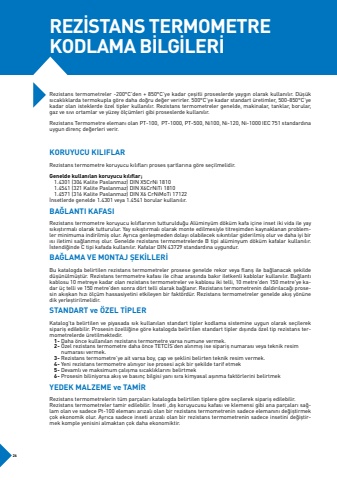 Rezistans termometreler -200%u00b0C%u2019den + 850%u00b0C%u2019ye kadar %u00e7e%u015fitli proseslerde yayg%u0131n olarak kullan%u0131l%u0131r. D%u00fc%u015f%u00fck s%u0131cakl%u0131klarda termokupla g%u00f6re daha do%u011fru de%u011fer verirler. 500%u00b0C%u2019ye kadar standart %u00fcretimler, 500-850%u00b0C%u2019ye kadar olan isteklerde %u00f6zel tipler kullan%u0131l%u0131r. Rezistans termometreler genelde, makinalar, tanklar, borular, gaz ve s%u0131v%u0131 ortamlar ve y%u00fczey %u00f6l%u00e7%u00fcmleri gibi proseslerde kullan%u0131l%u0131r.Rezistans Termometre eleman%u0131 olan PT-100, PT-1000, PT-500, Ni100, Ni-120, Ni-1000 IEC 751 standard%u0131na uygun diren%u00e7 de%u011ferleri verir.KORUYUCU KILIFLARRezistans termometre koruyucu k%u0131l%u0131flar%u0131 proses %u015fartlar%u0131na g%u00f6re se%u00e7ilmelidir.Genelde kullan%u0131lan koruyucu k%u0131l%u0131flar;1.4301 (304 Kalite Paslanmaz) DIN X5CrNi 18101.4541 (321 Kalite Paslanmaz) DIN X6CrNiTi 18101.4571 (316 Kalite Paslanmaz) DIN X6 CrNiMoTi 17122%u0130nsetlerde genelde 1.4301 veya 1.4541 borular kullan%u0131l%u0131r.BA%u011eLANTI KAFASIRezistans termometre koruyucu k%u0131l%u0131flar%u0131n%u0131n tutturuldu%u011fu Al%u00fcminy%u00fcm d%u00f6k%u00fcm kafa i%u00e7ine inset iki vida ile yay s%u0131k%u0131%u015ft%u0131rmal%u0131 olarak tutturulur. Yay s%u0131k%u0131%u015ft%u0131rmal%u0131 olarak monte edilmesiyle titre%u015fimden kaynaklanan problemler minimuma indirilmi%u015f olur. Ayr%u0131ca genle%u015fmeden dolay%u0131 olabilecek s%u0131k%u0131nt%u0131lar giderilmi%u015f olur ve daha iyi bir %u0131s%u0131 iletimi sa%u011flanm%u0131%u015f olur. Genelde rezistans termometrelerde B tipi al%u00fcminyum d%u00f6k%u00fcm kafalar kullan%u0131l%u0131r. %u0130stendi%u011finde C tipi kafada kullan%u0131l%u0131r. Kafalar DIN 43729 standard%u0131na uygundur.BA%u011eLAMA VE MONTAJ %u015eEK%u0130LLER%u0130Bu katalogda belirtilen rezistans termometreler prosese genelde rekor veya flan%u015f ile ba%u011flanacak %u015fekilde d%u00fc%u015f%u00fcn%u00fclm%u00fc%u015ft%u00fcr. Rezistans termometre kafas%u0131 ile cihaz aras%u0131nda bak%u0131r iletkenli kablolar kullan%u0131l%u0131r. Ba%u011flant%u0131 kablosu 10 metreye kadar olan rezistans termometreler ve kablosu iki telli, 10 metre%u2019den 150 metre%u2019ye kadar %u00fc%u00e7 telli ve 150 metre%u2019den sonra d%u00f6rt telli olarak ba%u011flan%u0131r. Rezistans termometrenin dald%u0131r%u0131laca%u011f%u0131 prosesin ak%u0131%u015fkan h%u0131z%u0131 %u00f6l%u00e7%u00fcm hassasiyetini etkileyen bir fakt%u00f6rd%u00fcr. Rezistans termometreler genelde ak%u0131%u015f y%u00f6n%u00fcne dik yerle%u015ftirilmelidir.STANDART ve %u00d6ZEL T%u0130PLERKatalog%u2019ta belirtilen ve piyasada s%u0131k kullan%u0131lan standart tipler kodlama sistemine uygun olarak se%u00e7ilerek sipari%u015f edilebilir. Prosesin %u00f6zelli%u011fine g%u00f6re katalogda belirtilen standart tipler d%u0131%u015f%u0131nda %u00f6zel tip rezistans termometrelerde %u00fcretilmektedir.1- Daha %u00f6nce kullan%u0131lan rezistans termometre varsa numune vermek.2- %u00d6zel rezistans termometre daha %u00f6nce TETC%u0130S%u2019den al%u0131nm%u0131%u015f ise sipari%u015f numaras%u0131 veya teknik resim numaras%u0131 vermek.3- Rezistans termometre%u2019ye ait varsa boy, %u00e7ap ve %u015feklini belirten teknik resim vermek.4- Yeni rezistans termometre al%u0131n%u0131yor ise prosesi a%u00e7%u0131k bir %u015fekilde tarif etmek5- Devaml%u0131 ve maksimum %u00e7al%u0131%u015fma s%u0131cakl%u0131klar%u0131n%u0131 belirtmek6- Prosesin biliniyorsa ak%u0131%u015f ve bas%u0131n%u00e7 bilgisi yan%u0131 s%u0131ra kimyasal a%u015f%u0131nma fakt%u00f6rlerini belirtmekYEDEK MALZEME ve TAM%u0130RRezistans termometrelerin t%u00fcm par%u00e7alar%u0131 katalogda belirtilen tiplere g%u00f6re se%u00e7ilerek sipari%u015f edilebilir.Rezistans termometreler tamir edilebilir. %u0130nseti ,d%u0131%u015f koruyucusu kafas%u0131 ve klemensi gibi ana par%u00e7alar%u0131 sa%u011flam olan ve sadece Pt-100 eleman%u0131 ar%u0131zal%u0131 olan bir rezistans termometrenin sadece eleman%u0131n%u0131 de%u011fi%u015ftirmek %u00e7ok ekonomik olur. Ayr%u0131ca sadece inseti ar%u0131zal%u0131 olan bir rezistans termometrenin sadece insetini de%u011fi%u015ftirmek komple yenisini almaktan %u00e7ok daha ekonomiktir.REZ%u0130STANS TERMOMETREKODLAMA B%u0130LG%u0130LER%u013026