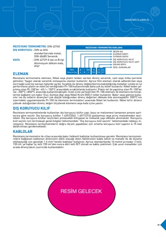 REZ%u0130STANS TERMOMETRE: DIN 43760DI%u015e KORUYUCU: DIN ve AISI standartlar%u0131nda metal, DIN 40685 SeramikKAFA: DIN 43729 A tipi ve B tipi Al%u00fcminyum d%u00f6k%u00fcm kafa, IP67ELEMANRezistans termometre eleman%u0131, Nikel veya platin telden sar%u0131lan diren%u00e7 seramik, cam veya mika i%u00e7erisine g%u00f6m%u00fcl%u00fcr. Yayg%u0131n olarak seramik izolasyonlu olanlar kullan%u0131l%u0131r. Ayr%u0131ca film eleman olarak adland%u0131r%u0131lan veya sert ka%u011f%u0131t %u00fczerine sar%u0131lan tiplerde vard%u0131r. S%u0131cakl%u0131k ile diren%u00e7 de%u011fi%u015fimlerine bak%u0131ld%u0131%u011f%u0131nda metaller i%u00e7inde en iyi performans%u0131 platin ve nikel tel verdi%u011finden Pt-100 kullan%u0131m%u0131nda daha %u00e7ok bu teller kullan%u0131l%u0131r. Nikel teden yap%u0131lm%u0131%u015f olan Pt-100%u2019ler -60 / + 150%u00b0C aras%u0131ndaki s%u0131cakl%u0131klarda kullan%u0131l%u0131r. Platin tel ile yap%u0131lm%u0131%u015f olan Pt-100%u2019ler ise -250%u00b0C +850%u00b0C aras%u0131nda kullan%u0131lmaktad%u0131r. %u0130nset i%u00e7ine yerle%u015ftirilen Pt-100 eleman%u0131 ile klemens terminallerine ba%u011flant%u0131 i%u00e7in bak%u0131r (Cu), G%u00fcm%u00fc%u015f (Ag) veya Nikel Krom (N%u0130Cr) teller kullan%u0131l%u0131r. Bak%u0131r veya g%u00fcm%u00fc%u015f kullan%u0131l%u0131r ise bu tellerin diren%u00e7leri %u00e7ok d%u00fc%u015f%u00fck oldu%u011fundan diren%u00e7 de%u011ferleri dikkate bile al%u0131nmayabilir. 550%u00b0C%u2019nin %u00fczerindeki uygulamalarda Pt-100 ile klemens terminalleri aras%u0131nda Nikel tel kullan%u0131l%u0131r. Nikel tel%u2019in direnci y%u00fcksek oldu%u011fundan diren%u00e7 de%u011feri %u00f6l%u00e7%u00fclerek klemens veya kafa i%u00e7ine yaz%u0131l%u0131r.DI%u015e KORUYUCU KILIFRezistans termometrelerde kullan%u0131lan d%u0131%u015f koruyucu k%u0131l%u0131f%u0131n %u00e7ap%u0131, boyu ve malzemesi tamamen proses %u015fart,lar%u0131na g%u00f6re se%u00e7ilir. D%u0131%u015f koruyucu k%u0131l%u0131flar 1.4301(304), 1.4571(316) paslanmaz veya prin%u00e7 malzemeden se%u00e7ilebilir. D%u0131%u015f koruyucu k%u0131l%u0131flar se%u00e7ilirken prosesdeki kimyasal ve mekanik yap%u0131 dikkate al%u0131nmal%u0131d%u0131r. Koruyucu k%u0131l%u0131f se%u00e7imi i%u00e7in termokupl genel bilgiler b%u00f6l%u00fcm%u00fcndeki %u201cD%u0131%u015f koruyucu k%u0131l%u0131f se%u00e7imi%u201d b%u00f6l%u00fcm%u00fcndeki tabloyu inceleyiniz. Rezistans termometrelerin do%u011fru %u00f6l%u00e7%u00fcm yapabilesi i%u00e7in ortama koruyucu k%u0131l%u0131f %u00e7ap%u0131n%u0131n 6-15 kat%u0131 dald%u0131r%u0131lmas%u0131 gerekmektedir.KABLOLARRezistans termometre ile cihaz aras%u0131nda bak%u0131r iletkenli kablolar kullan%u0131lmas%u0131 gerekir. Rezistans termometrelere ba%u011flanan kablonun direncinin etkili olaca%u011f%u0131 diren fakt%u00f6r%u00fcn%u00fcn kablo kesiti ve mesafe ile de %u00f6l%u00e7%u00fcm%u00fc etkileyece%u011fi i%u00e7in genelde 1,5 mm2 kesitli kablolar kullan%u0131l%u0131r. Ayr%u0131ca standartlarda 10 metre%u2019ye kadar 2 telli, 150 mt.%u2019ye kadar %u00fc%u00e7 telli 150 mt%u2019den sonra d%u00f6rt telli R/T olmal%u0131 ve kablo %u00e7ekilmeli. %u00c7ok uzun mesafeler i%u00e7in arada diren%u00e7/ak%u0131m %u00e7eviricide kullan%u0131labilir.REZ%u0130STANS TERMOMETRE KODLAMATR01 - B 1 M3 - 10 - 16 EXResim No A B C DD EE FFRES%u0130M NOELEMAN SINIFIELEMAN SAYISIDI%u015e KORUYUCU KILIFDI%u015e KORUYUCU KILIF %u00c7APIDALMA BOYU%u00d6ZEL DURUMLAR27www.tetcis.com.trRES%u0130M GELECEK