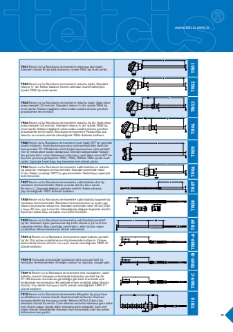 TR01 Resim no%u2019lu Rezistans termometre rekorsuz d%u00fcz tipdir.Standart olarak B tipi kafa kullan%u0131l%u0131r, i%u00e7inde TR05 tip inset vard%u0131r.TR01TR02 Resim no%u2019lu Rezistans termometre rekorlu tipdir. Standart rekoru %u00bd%u201d dir. Rekor kafan%u0131n hemen alt%u0131ndan monte edilmi%u015ftir. %u0130%u00e7inde TR05 tip inset vard%u0131r.TR02TR03 Resim no%u2019lu Rezistans termometre rekorlu tipdir. Kafa rekor aras%u0131 mesafe 120 mm%u2019dir. Standart rekoru %u00bd%u201ddir. i%u00e7inde TR05 tip inset vard%u0131r. Kafan%u0131n ba%u011flant%u0131 rekorundan uzakta olmas%u0131 gereken proseslerde tercih edilir.TR03TR04 Resim no%u2019lu Rezistans termometre rekorlu tip dir. Kafa rekor aras%u0131 mesafe 145 mm%u2019dir. Standart rekoru %u00bd%u201ddir. %u0130%u00e7inde TR05 tip inset vard%u0131r. Kafan%u0131n ba%u011flant%u0131 rekorundan uzakta olmas%u0131 gereken proseslerde tercih edilir. Rezistans termometre Paslanmaz ara rekorlu ve unionlu olarak istendi%u011finde TR04-Aolarak kodlan%u0131r.TR04TR05 Resim no%u2019lu Rezistans termometre inset tipdir. R/T%u2019ler genelde insetli kullan%u0131l%u0131r. %u0130nset d%u0131%u015f koruyucunun i%u00e7ine yerle%u015ftirilen ikinci bir koruyucudur. Pt-100 eleman inset d%u0131%u015f koruyucusunun i%u00e7ine yerle%u015ftirilir ve metal oksit tozlar%u0131 doldurulur. Eleman kafaya kadar kullan%u0131lan g%u00fcm%u00fc%u015f tel%u2019in u%u00e7lar%u0131 klemense tutturulur, inset daha sonra R/T%u2019nin d%u0131%u015f k%u0131l%u0131f%u0131 i%u00e7erisine yerle%u015ftirilir. TR01, TR02, TR03ve TR04 i%u00e7inde inset vard%u0131r. Sipari%u015fte %u0130nset boyu boy hanesine mm olarak yaz%u0131l%u0131r.TR05TR06 Resim no%u2019lu Rezistans termometre sabit kablolu ve rekorlu tip basit bir rezistans termometredir. Standart %u00fcretimde rekor %u00bd%u201ddir. Rekor s%u0131cakl%u0131%u011f%u0131 100%u00b0C%u2019yi ge%u00e7memelidir. Kablo boyu sipari%u015fte belirtilmelidir.TR06TR07 Resim no%u2019lu Rezistans termometre sabit kablolu d%u00fcz tip rezistans termometredir. Kablo ucunda d%u00fcz bir boru vard%u0131r.Bu boru L1 boyunda de%u011fi%u015fik %u00e7aplarda %u00fcretilir. Kablo %u00e7%u0131k%u0131%u015f%u0131nayay istendi%u011finde TR07-Aolarak kodlan%u0131r.TR07TR08 Resim no%u2019lu Rezistans termometre sabit kablolu bayonet tip rezistans termometredir. Rezistans termometrenin u%u00e7 k%u0131sm%u0131 yay rekoru ile prosese s%u0131k%u0131%u015ft%u0131r%u0131l%u0131r. Standart %u00fcretimde rekor M12x1,5%u2019dir. L boyu 30 mm, %u00e7ap 6 mm%u2019dir. %u0130stendi%u011finde de%u011fi%u015fik boylarda %u00fcretilir. Sipari%u015fte kablo boyu ve kablo cinsi belirtilmelidir.TR08TR09 Resim no%u2019lu Rezistans termometre sabit kablolu portatif tip%u2019dir. Standart tipler paslanmaz d%u0131%u015f k%u0131l%u0131fl%u0131 olarak 4,5,6 ve 8 mm %u00e7aplarda %u00fcretilir. Boy uzunlu%u011fu se%u00e7ilirken L elle tutulan sap%u0131n s%u0131cakl%u0131ktan etkilenmemesine dikkat edilmelidir.TR09TR09-A Resim no%u2019lu Rezistans termometre sabit kablolu portatif tip%u2019dir. D%u00fcz y%u00fczey s%u0131cakl%u0131klar%u0131n%u0131n %u00f6l%u00e7%u00fclmesinde kullan%u0131l%u0131r. Y%u00fczeye bast%u0131r%u0131larak temas ettirilir. Ucu a%u00e7%u0131l%u0131 olarak istendi%u011finde TR09-A1 olarak kodlan%u0131r.TR09-ATR09-B Yumu%u015fak ortamlarda kullan%u0131lan i%u011fne u%u00e7lu,portatif tip rezistans termometredir. %u00d6rne%u011fin; hamur, et, kau%u00e7uk, s%u00fcnger gibi.TR09-BTR09-C Resim no%u2019lu Rezistans termometre elle tutulabilen, sabit kablolu, korozif olmayan ortamlarda kullan%u0131lan portatif tip%u2019dir. Pt-100 eleman resimde de g%u00f6r%u00fcld%u00fc%u011f%u00fc gibi belli oranlarda a%u00e7%u0131k b%u0131rak%u0131larak korunmu%u015ftur. Bu %u015fekilde ortam s%u0131cakl%u0131%u011f%u0131 daha hassas %u00f6l%u00e7%u00fcl%u00fcr. Ucu delikli koruyucu k%u0131l%u0131fl%u0131 olarak istendi%u011finde TR09-C1 olarak kodlan%u0131r.TR09-CTR10 Resim no%u2019lu Rezistans termometre Minyat%u00fcr tip olup hava s%u0131cakl%u0131klar%u0131n%u0131n hassas olarak %u00f6l%u00e7%u00fclmesinde kullan%u0131l%u0131r. Eleman%u0131koruyan delikli bir koruyucu vard%u0131r. Rekoru M10x1,5%u2019dur.Camelemanl%u0131 olarak%u2019da verilir. Cam eleman seramik elemana g%u00f6re daha h%u0131zl%u0131 %u00f6l%u00e7%u00fcm yapar. Ancak di%u011fer elemana g%u00f6re pahal%u0131d%u0131r. Cam elemanl%u0131 olarak istendi%u011finde standart tipin sonundaki %u00f6zel durumlarb%u00f6l%u00fcm%u00fcne cam yaz%u0131l%u0131r.TR1031www.tetcis.com.tr