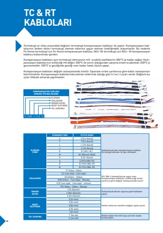TC & RTKABLOLARITermokupl ve cihaz aras%u0131ndaki ba%u011flant%u0131 termokupl kompanzasyon kablolar%u0131 ile yap%u0131l%u0131r. Kompanzasyon kab,lolar%u0131n%u0131n iletken telleri termokupl eleman tellerine uygun eleman %u00f6zelli%u011findeki ala%u015f%u0131mlard%u0131r. Bu nedenle Fe-Konst termokupl i%u00e7in Fe-Konst kompanzasyon kablosu, NiCr-Ni termokupl i%u00e7in NiCr- Ni kompanzasyon kablosu kullan%u0131lmas%u0131 gerekir.Kompanzasyon kablolar%u0131 ayn%u0131 termokupl eleman%u0131n%u0131n mV- s%u0131cakl%u0131k %u00f6zelliklerini 200%u00b0C%u2019ye kadar sa%u011flar. Kompanzasyon kablolar%u0131n%u0131n %u00fcretece%u011fi mV de%u011feri 200%u00b0C ile s%u0131n%u0131rl%u0131 oldu%u011fundan %u00e7al%u0131%u015fma ortam s%u0131cakl%u0131klar%u0131 200%u00b0C%u2019yi ge%u00e7memelidir. 200%u00b0C%u2019yi ge%u00e7ti%u011finde ge%u00e7ti%u011fi oran kadar hatal%u0131 %u00f6l%u00e7%u00fcm yapar.Kompanzasyon kablolar%u0131 de%u011fi%u015fik izolasyonlarda %u00fcretilir. Sipari%u015fte ortam %u015fartlar%u0131na g%u00f6re kablo izolasyonlar%u0131 belirtilmelidir. Kompanzasyon kablolar%u0131nda eleman tellerinde oldu%u011fu gibi (+) ve (-) u%u00e7lar%u0131 vard%u0131r. Ba%u011flant%u0131 bu u%u00e7lar dikkate al%u0131narak yap%u0131lmal%u0131d%u0131r.KOMPANZASYON TABLOSUS%u0130PAR%u0130%u015e T%u0130P%u0130 BEL%u0130RLEMEK SCB 2 x1,5 %u00c7ELEMAN%u0130ZOLASYONDAMAR SAYISIKES%u0130T (%u0130LETKEN)TEL DURUMUELEMANC%u0130NS%u0130STANDART KODTETC%u0130S KODUKullan%u0131lacak olan kompanzasyon kablosutermokupl eleman%u0131 ile ayn%u0131 olmal%u0131d%u0131r.UU (Cu-Konst)TT (Cu-Konst)LL ( Fe-Konst)JJ ( Fe-Konst)KK ( NiCr-Ni )NN ( Nikrosil-Nisil)EE (Cr-Konst)SS (Pt%10Rh-Pt)RR ( Pt%13Rh-Pt)BB ( Pt%18Rh-Pt)%u0130ZOLASYONTT Teflon -TeflonIEC-584-3 standartlar%u0131na uygun olankompanzasyon kablolar%u0131, kullan%u0131ca%u011f%u0131 ortam%u015farlar%u0131na g%u00f6re de%u011fi%u015fik izolasyonlarda se%u00e7ilir.CC Cam elyaf - Cam elyafSS Silikon - SilikonSCB Silikon - Cam Elyaf - BlendajCCE Cam elyaf - Cam elyaf - elemanTTE Teflon - Teflon - ElemanDAMARSAYISI2 %u0130ki Damarl%u0131 Kullan%u0131lacak damar say%u0131s%u0131na g%u00f6re kodlama yap%u0131l%u0131r.4 D%u00f6rt Damarl%u01316 Alt%u0131 Damarl%u0131KES%u0130T(%u0130LETKEN)0,22 mm2%u0130letken tellerinin kesitleri de%u011fi%u015fik %u00e7apta se%u00e7ilir.0,35 mm20,50 mm2 0,75 mm2 1,50 mm2TEL DURUMUT Tek telli%u0130letken telleri tek telli veya %u00e7ok telli olarak %u00c7 %u00c7ok tellikullan%u0131labilir.32