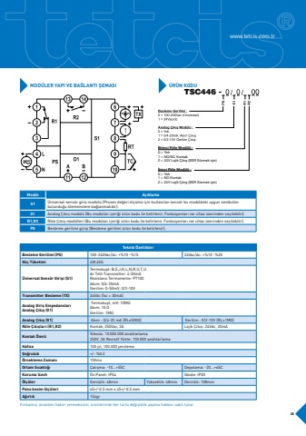 Firmam%u0131z, %u00f6nceden haber vermeksizin, %u00fcr%u00fcnlerinde her t%u00fcrl%u00fc de%u011fi%u015fiklik yapma hakk%u0131n%u0131 sakl%u0131 tutar.Mod%u00fclA%u00e7%u0131klamaS1%u00dcniversal sens%u00f6r giri%u015f mod%u00fcl%u00fc (Proses de%u011feri %u00f6l%u00e7%u00fcm%u00fc i%u00e7in kullan%u0131lan sens%u00f6r bu mod%u00fcldeki uygun sembol%u00fcnbulundu%u011fu klemenslere ba%u011flanmal%u0131d%u0131r).01Analog %u00c7%u0131k%u0131%u015f mod%u00fcl%u00fc (Bu mod%u00fcl%u00fcn i%u00e7eri%u011fi %u00fcr%u00fcn kodu ile belirlenir. Fonksiyonlar%u0131 ise cihaz %u00fczerinden se%u00e7ilebilir).R1,R2R%u00f6le %u00c7%u0131k%u0131%u015f mod%u00fclleri (Bu mod%u00fcl%u00fcn i%u00e7eri%u011fi %u00fcr%u00fcn kodu ile belirlenir. Fonksiyonlar%u0131 ise cihaz %u00fczerinden se%u00e7ilebilir).PSBesleme gerilimi giri%u015fi (Besleme gerilimi %u00fcr%u00fcn kodu ile belirlenir).Teknik %u00d6zelliklerBesleme Gerilimi (PS)100-240Vac/dc: +%10 -%1524Vac/dc: +%10 -%20G%u00fc%u00e7 T%u00fcketimi4W,6VA%u00dcniversal Sens%u00f6r Giri%u015fi (S1)Termokupl: B,E,J,K,L,N,R,S,T,U iki Telli Transmitter: 4-20mARezistans Termometre: PT100 Ak%u0131m: 0/4-20mA Gerilim: 0-50mV, 0/2-10VTransmitter Besleme (TX)24Vdc (%u0130sc = 30mA)Analog Giri%u015f Empedanslar%u0131Analog %u00c7%u0131k%u0131%u015f (01) Termokupl, mV: 10M%u2126Ak%u0131m: 10 %u2126Gerilim: 1M%u2126Analog %u00c7%u0131k%u0131%u015f (01)Ak%u0131m : 0/4-20 mA (RL%u2264500%u2126)Gerilim : 0/2-10V (RL%u22651M%u2126)R%u00f6le %u00c7%u0131k%u0131%u015flar%u0131 (R1,R2)Kontak; 250Vac, 3ALojik %u00c7%u0131k%u0131%u015f: 24Vdc, 20mAKontak %u00d6mr%u00fcY%u00fcks%u00fcz: 10.000.000 anahtarlama250V, 3A Rezistif Y%u00fckte: 100.000 anahtarlamaHaf%u0131za100 y%u0131l, 100.000 yenilemeDo%u011fruluk+/- %0.2%u00d6rnekleme Zaman%u0131100msOrtam S%u0131cakl%u0131%u011f%u0131%u00c7al%u0131%u015fma: -10...+55CDepolama: -20...+65CKoruma S%u0131n%u0131f%u0131%u00d6n Panel: IP54G%u00f6vde: IP20%u00d6l%u00e7%u00fclerGeni%u015flik: 48mm Y%u00fckseklik: 48mmDerinlik: 108mmPano kesim %u00f6l%u00e7%u00fcleri45+/-0.5 mm x 45+/-0.5 mmA%u011f%u0131rl%u0131k154grMOD%u00dcLER YAPI VE BA%u011eLANTI %u015eEMASI%u00dcR%u00dcN KODU35www.tetcis.com.trTSC446Birinci R%u00f6le Mod%u00fcl%u00fc :0 = Yok1 = NO/NC Kontak2 = 24V Lojik %u00c7%u0131k%u0131%u015f (SSR S%u00fcrmek i%u00e7in)%u0130kinci R%u00f6le Mod%u00fcl%u00fc :0 = Yok1 = NO Kontak2 = 24V Lojik %u00c7%u0131k%u0131%u015f (SSR S%u00fcrmek i%u00e7in)