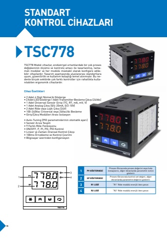 STANDARTKONTROL C%u0130HAZLARITSC778 TSC778 Model cihazlar, end%u00fcstriyel ortamlardaki bir %u00e7ok proses de%u011fi%u015fkeninin %u00f6l%u00e7%u00fcm%u00fc ve kontrol%u00fc amac%u0131 ile tasarlanm%u0131%u015f, tamamen mod%u00fcler ve her mod%u00fcl%u00fc m%u00fcstakil olarak konfig%u00fcre edilebilir cihazlard%u0131r. Tasar%u0131m a%u015famas%u0131nda uluslararas%u0131 standartlara uyum, g%u00fcvenilirlik ve kullan%u0131m kolayl%u0131%u011f%u0131 temel al%u0131nm%u0131%u015ft%u0131r. Bu nedenle bir%u00e7ok sekt%u00f6rde %u00e7ok farkl%u0131 kontroller i%u00e7in rahatl%u0131kla kullan%u0131labilen ergonomik cihazlard%u0131r.Cihaz %u00d6zellikleri%u2022 2 Adet 4 Digit N%u00fcmerik G%u00f6sterge%u2022 2 Adet LED G%u00f6sterge 1 Adet Transmitter Besleme %u00c7%u0131k%u0131%u015f%u0131 (24Vdc) %u2022 1 Adet %u00dcniversal Sens%u00f6r Giri%u015fi (TC, RT, mA, mV, V)%u2022 1 Adet Analog %u00c7%u0131k%u0131%u015f (0/4-20mA, 0/2-10V)%u2022 2 Adet R%u00f6le veya Lojik %u00c7%u0131k%u0131%u015f (24V)%u2022 100-240Vac %u00dcniversal veya 24Vac/dc Besleme%u2022 Giri%u015f/%u00c7%u0131k%u0131%u015f Mod%u00fclleri Aras%u0131 %u0130zolasyon%u2022 Auto-Tuning (PID parametrelerinin otomatik ayar%u0131)%u2022 Sens%u00f6r Ar%u0131za Tespiti%u2022 9 Farkl%u0131 R%u00f6le Fonksiyonu%u2022 ON/OFF, P, Pl, PD, PID Kontrol%u2022 Lineer ve Zaman-Oransal Kontrol %u00c7%u0131k%u0131%u015f%u0131%u2022 100ms %u00d6rnekleme ve Kontrol %u00c7evrimi%u2022 Bilgisayar %u00fczerinden konfig%u00fcrasyon1PV G%u00d6STERGES%u0130Proses-Ekran%u0131nda proses de%u011ferini veya hata mesajlar%u0131n%u0131, di%u011fer ekranlarda parametre ismini g%u00f6sterir.2SP G%u00d6STERGES%u0130Proses-Ekran%u0131nda kontrol set de%u011feri, di%u011fer ekranlarda parametre de%u011ferini g%u00f6sterir. 3R1 LED%u0130%u201cR1%u201d R%u00f6le mod%u00fcl%u00fc enerjili iken yanar.4R2 LED%u0130%u201cR2%u201d R%u00f6le mod%u00fcl%u00fc enerjili iken yanar.TSC77836