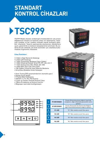STANDARTKONTROL C%u0130HAZLARITSC999 TSC999 Model cihazlar, end%u00fcstriyel ortamlardaki bir %u00e7ok proses de%u011fi%u015fkeninin %u00f6l%u00e7%u00fcm%u00fc ve kontrol%u00fc amac%u0131 ile tasarlanm%u0131%u015f, tamamen mod%u00fcler ve her mod%u00fcl%u00fc m%u00fcstakil olarak konfig%u00fcre edilebilir cihazlard%u0131r. Tasar%u0131m a%u015famas%u0131nda uluslararas%u0131 standartlara uyum, g%u00fcvenilirlik ve kullan%u0131m kolayl%u0131%u011f%u0131 temel al%u0131nm%u0131%u015ft%u0131r. Bu nedenle bir%u00e7ok sekt%u00f6rde %u00e7ok farkl%u0131 kontroller i%u00e7in rahatl%u0131kla kullan%u0131labilen ergonomik cihazlard%u0131r.Cihaz %u00d6zellikleri%u2022 2 Adet 4 Digit N%u00fcmerik G%u00f6sterge%u2022 4 Adet LED G%u00f6sterge%u2022 1 Adet Transmitter Besleme %u00c7%u0131k%u0131%u015f%u0131 (24Vdc)%u2022 1 Adet %u00dcniversal Sens%u00f6r Giri%u015fi (TC, RT, mA, mV, V%u2022 1 Adet Analog %u00c7%u0131k%u0131%u015f (0/4-20mA, 0/2-10V)%u2022 4 Adet R%u00f6le veya Lojik %u00c7%u0131k%u0131%u015f (24V)%u2022 100-240Vac %u00dcniversal veya 24Vac/dc Besleme%u2022 Giri%u015f/%u00c7%u0131k%u0131%u015f Mod%u00fclleri Aras%u0131 %u0130zolasyon%u2022 Auto-Tuning (PID parametrelerinin otomatik ayar%u0131)%u2022 Sens%u00f6r Ar%u0131za Tespiti%u2022 9 Farkl%u0131 R%u00f6le Fonksiyonu%u2022 ON/OFF, P, PI, PD, PID Kontrol%u2022 Lineer ve Zaman-Oransal Kontrol %u00c7%u0131k%u0131%u015f%u0131%u2022 100ms %u00d6rnekleme ve Kontrol %u00c7evrimi%u2022 Bilgisayar %u00fczerinden konfig%u00fcrasyon 1PV G%u00d6STERGES%u0130Proses-Ekran%u0131nda proses de%u011ferini veya hata mesajlar%u0131n%u0131, di%u011fer ekranlarda parametre ismini g%u00f6sterir.2SP G%u00d6STERGES%u0130Proses-Ekran%u0131nda iken Kontrol Set De%u011ferini di%u011fer ekranlarda parametre de%u011ferini g%u00f6sterir.3R1 LED%u0130%u201cR1%u201d R%u00f6le mod%u00fcl%u00fc enerjili %u0130ken yanar.4R2 LED%u0130%u201cR2%u201d R%u00f6le mod%u00fcl%u00fc enerjili %u0130ken yanar.5R3 LED%u0130%u201cR3%u201d R%u00f6le mod%u00fcl%u00fc enerjili %u0130ken yanar.6R4 LED%u0130%u201cR4%u201d R%u00f6le mod%u00fcl%u00fc enerjili %u0130ken yanar.TSC99938