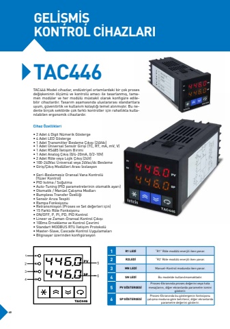 GEL%u0130%u015eM%u0130%u015eKONTROL C%u0130HAZLARITAC446 TAC446 Model cihazlar, end%u00fcstriyel ortamlardaki bir %u00e7ok proses de%u011fi%u015fkeninin %u00f6l%u00e7%u00fcm%u00fc ve kontrol%u00fc amac%u0131 ile tasarlanm%u0131%u015f, tamamen mod%u00fcler ve her mod%u00fcl%u00fc m%u00fcstakil olarak konfig%u00fcre edilebilir cihazlard%u0131r. Tasar%u0131m a%u015famas%u0131nda uluslararas%u0131 standartlara uyum, g%u00fcvenilirlik ve kullan%u0131m kolayl%u0131%u011f%u0131 temel al%u0131nm%u0131%u015ft%u0131r. Bu nedenle bir%u00e7ok sekt%u00f6rde %u00e7ok farkl%u0131 kontroller i%u00e7in rahatl%u0131kla kullan%u0131labilen ergonomik cihazlard%u0131r.Cihaz %u00d6zellikleri%u2022 2 Adet 4 Digit N%u00fcmerik G%u00f6sterge%u2022 4 Adet LED G%u00f6sterge%u2022 1 Adet Transmitter Besleme %u00c7%u0131k%u0131%u015f%u0131 (24Vdc)%u2022 1 Adet %u00dcniversal Sens%u00f6r Giri%u015fi (TC, RT, mA, mV, V)%u2022 1 Adet RS485 %u0130leti%u015fim Birimi%u2022 1 Adet Analog %u00c7%u0131k%u0131%u015f (0/4-20mA, 0/2-10V)%u2022 2 Adet R%u00f6le veya Lojik %u00c7%u0131k%u0131%u015f (24V)%u2022 100-240Vac %u00dcniversal veya 24Vac/dc Besleme%u2022 Giri%u015f/%u00c7%u0131k%u0131%u015f Mod%u00fclleri Aras%u0131 %u0130zolasyon%u2022 Geri-Beslemesiz Oransal Vana Kontrol%u00fc (Y%u00fczer Kontrol)%u2022 PID Is%u0131tma / So%u011futma%u2022 Auto-Tuning (PID parametrelerinin otomatik ayar%u0131)%u2022 Otomatik / Man%u00fcel %u00c7al%u0131%u015fma Modlar%u0131%u2022 Bumpless Transfer %u00d6zelli%u011fi%u2022 Sens%u00f6r Ar%u0131za Tespiti%u2022 Rampa Fonksiyonu%u2022 Retransmisyon (Proses ve Set de%u011ferleri i%u00e7in)%u2022 15 Farkl%u0131 R%u00f6le Fonksiyonu%u2022 ON/OFF, P, Pl, PD, PID Kontrol%u2022 Lineer ve Zaman-Oransal Kontrol %u00c7%u0131k%u0131%u015f%u0131%u2022 100ms %u00d6rnekleme ve Kontrol %u00c7evrimi%u2022 Standart MODBUS RTU %u0130leti%u015fim Protokol%u00fc%u2022 Master-Slave, Cascade Kontrol Uygulamalar%u0131%u2022 Bilgisayar %u00fczerinden konfig%u00fcrasyon1R1 LED%u0130%u201cR1%u201d R%u00f6le mod%u00fcl%u00fc enerjili iken yanar.2R2LED%u0130%u201cR2%u2019 R%u00f6le mod%u00fcl%u00fc enerjili iken yanar.3MN LED%u0130Manuel-Kontrol modunda iken yanar.4SN LED%u0130Bu modelde kullan%u0131lmamaktad%u0131r.5PV G%u00d6STERGES%u0130Proses-Ekran%u0131nda proses de%u011ferini veya hata mesajlar%u0131n%u0131, di%u011fer ekranlarda parametre ismini g%u00f6sterir.6SP G%u00d6STERGES%u0130Proses-Ekran%u0131nda bu g%u00f6stergenin fonksiyonu %u00e7al%u0131%u015fma moduna g%u00f6re belirlenir, di%u011fer ekranlarda parametre de%u011ferini g%u00f6sterir.TAC44640