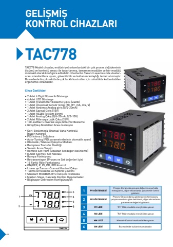 GEL%u0130%u015eM%u0130%u015eKONTROL C%u0130HAZLARITAC778 TAC778 Model cihazlar, end%u00fcstriyel ortamlardaki bir %u00e7ok proses de%u011fi%u015fkeninin %u00f6l%u00e7%u00fcm%u00fc ve kontrol%u00fc amac%u0131 ile tasarlanm%u0131%u015f, tamamen mod%u00fcler ve her mod%u00fcl%u00fc m%u00fcstakil olarak konfig%u00fcre edilebilir cihazlard%u0131r. Tasar%u0131m a%u015famas%u0131nda uluslararas%u0131 standartlara uyum, g%u00fcvenilirlik ve kullan%u0131m kolayl%u0131%u011f%u0131 temel al%u0131nm%u0131%u015ft%u0131r. Bu nedenle bir%u00e7ok sekt%u00f6rde %u00e7ok farkl%u0131 kontroller i%u00e7in rahatl%u0131kla kullan%u0131labilen ergonomik cihazlard%u0131r.Cihaz %u00d6zellikleri%u2022 2 Adet 4 Digit N%u00fcmerik G%u00f6sterge%u2022 4 Adet LED G%u00f6sterge%u2022 1 Adet Transmitter Besleme %u00c7%u0131k%u0131%u015f%u0131 (24Vdc)%u2022 1 Adet %u00dcniversal Sens%u00f6r Giri%u015fi (TC, RT, mA, mV, V)%u2022 1 Adet Yard%u0131mc%u0131 Analog giri%u015f (0/4-20mA)%u2022 3 Adet Say%u0131sal Giri%u015f (15V)%u2022 1 Adet RS485 %u0130leti%u015fim Birimi%u2022 1 Adet Analog %u00c7%u0131k%u0131%u015f (0/4-20mA, 0/2-10V)%u2022 2 Adet R%u00f6le veya Lojik %u00c7%u0131k%u0131%u015f (24V)%u2022 100-240Vac %u00dcniversal veya 24Vac/dc Besleme%u2022 Giri%u015f/%u00c7%u0131k%u0131%u015f Mod%u00fclleri Aras%u0131 %u0130zolasyon%u2022 Geri-Beslemesiz Oransal Vana Kontrol%u00fc (Y%u00fczer Kontrol)%u2022 PID Is%u0131tma / So%u011futma%u2022 Auto-Tuning (PID parametrelerinin otomatik ayar%u0131)%u2022 Otomatik / Man%u00fcel %u00c7al%u0131%u015fma Modlar%u0131%u2022 Bumpless Transfer %u00d6zelli%u011fi%u2022 Sens%u00f6r Ar%u0131za Tespiti%u2022 Remote Set Point (Uzaktan set de%u011feri belirleme)%u2022 8 Adet Se%u00e7meli Set Noktas%u0131%u2022 Rampa Fonksiyonu%u2022 Retransmisyon (Proses ve Set de%u011ferleri i%u00e7in)%u2022 15 Farkl%u0131 R%u00f6le Fonksiyonu%u2022 ON/OFF, P, Pl, PD, PID Kontrol%u2022 Lineer ve Zaman-Oransal Kontrol %u00c7%u0131k%u0131%u015f%u0131%u2022 100ms %u00d6rnekleme ve Kontrol %u00c7evrimi%u2022 Standart MODBUS RTU %u0130leti%u015fim Protokol%u00fc%u2022 Master-Slave, Cascade Kontrol Uygulamalar%u0131%u2022 Bilgisayar %u00dczerinden Konfig%u00fcrasyon1PV G%u00d6STERGES%u0130Proses-Ekran%u0131nda proses de%u011ferini veya hata mesajlar%u0131n%u0131, di%u011fer ekranlarda parametre ismini g%u00f6sterir.2SP G%u00d6STERGES%u0130Proses-Ekran%u0131nda bu g%u00f6stergenin fonksiyonu %u00e7al%u0131%u015fma moduna g%u00f6re belirlenir, di%u011fer ekranlarda parametre de%u011ferini g%u00f6sterir.3R1 LED%u0130%u201cR1%u201d R%u00f6le mod%u00fcl%u00fc enerjili iken yanar.4R2 LED%u0130%u201cR2%u201d R%u00f6le mod%u00fcl%u00fc enerjili iken yanar.5MN LED%u0130Manuel-Kontrol modunda iken yanar.6SN LED%u0130Bu modelde kullan%u0131lmamaktad%u0131r.TAC77842