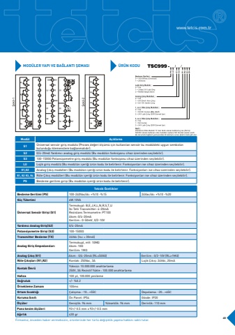 Mod%u00fclA%u00e7%u0131klamaS1%u00dcniversal sens%u00f6r giri%u015f mod%u00fcl%u00fc (Proses de%u011feri %u00f6l%u00e7%u00fcm%u00fc i%u00e7in kullan%u0131lan sens%u00f6r bu mod%u00fcldeki uygun sembol%u00fcnbulundu%u011fu klemenslere ba%u011flanmal%u0131d%u0131r).S20/4-20mA Yard%u0131mc%u0131 analog giri%u015f mod%u00fcl%u00fc (Bu mod%u00fcl%u00fcn fonksiyonu cihaz %u00fczerinden se%u00e7ilebilir).S3100-1500%u2126 Potansiyometre giri%u015f mod%u00fcl%u00fc (Bu mod%u00fcl%u00fcn fonksiyonu cihaz %u00fczerinden se%u00e7ilebilir).LULojik giri%u015f mod%u00fcl%u00fc (Bu mod%u00fcl%u00fcn i%u00e7eri%u011fi %u00fcr%u00fcn kodu ile belirlenir. Fonksiyonlar%u0131 ise cihaz %u00fczerinden se%u00e7ilebilir).01,02Analog %u00c7%u0131k%u0131%u015f mod%u00fclleri (Bu mod%u00fcl%u00fcn i%u00e7eri%u011fi %u00fcr%u00fcn kodu ile belirlenir. Fonksiyonlar%u0131 ise cihaz %u00fczerinden se%u00e7ilebilir).R1, R2 R3, R4R%u00f6le %u00c7%u0131k%u0131%u015f mod%u00fclleri (Bu mod%u00fcl%u00fcn i%u00e7eri%u011fi %u00fcr%u00fcn kodu ile belirlenir. Fonksiyonlar%u0131 ise cihaz %u00fczerinden se%u00e7ilebilir). PSBesleme gerilimi giri%u015fi (Bu mod%u00fcl%u00fcn i%u00e7eri%u011fi %u00fcr%u00fcn kodu ile belirlenir).MOD%u00dcLER YAPI VE BA%u011eLANTI %u015eEMASI%u00dcR%u00dcN KODUTeknik %u00d6zelliklerBesleme Gerilimi (PS)100-240Vac/dc: +%10 -%1524Vac/dc: +%10 -%20G%u00fc%u00e7 T%u00fcketimi6W.10VA%u00dcniversal Sens%u00f6r Giri%u015fi (S1)Termokupl: B,E,J,K,L,N,R,S,T,U%u0130ki Telli Transmitter: 4-20mARezistans Termometre: PT100Ak%u0131m: 0/4-20mAGerilim : 0-50mV, 0/2-10VYard%u0131mc%u0131 Analog Giri%u015f(S2)0/4-20mAPotansiyometre Giri%u015fi (S3)100-1500%u2126Transmitter Besleme (TX)24Vdc (Isc = 30mA) Analog Giri%u015f Empedanslar%u0131Termokupl, mV: 10M%u2126Ak%u0131m: 10%u2126 Gerilim: 1M%u2126Analog %u00c7%u0131k%u0131%u015f (01)Ak%u0131m : 0/4-20mA (RL%u2264500%u2126)Gerilim : 0/2-10V (RL%u22651M%u2126)R%u00f6le %u00c7%u0131k%u0131%u015flar%u0131 (R1,R2)Kontak: 250Vac, 3ALojik %u00c7%u0131k%u0131%u015f: 24Vdc, 20mAKontak %u00d6mr%u00fcY%u00fcks%u00fcz: 10.000.000 anahtarlama250V, 3A Rezistif Y%u00fckte : 100.000 anahtarlamaHaf%u0131za100 y%u0131l, 100.000 yenilemeDo%u011fruluk+/- %0.2%u00d6rnekleme Zaman%u0131100msOrtam S%u0131cakl%u0131%u011f%u0131%u00c7al%u0131%u015fma: -10...+55CDepolama: -20...+65CKoruma S%u0131n%u0131f%u0131%u00d6n Panel: IP54G%u00f6vde: IP20%u00d6l%u00e7%u00fclerGeni%u015flik: 96 mmY%u00fckseklik: 96 mmDerinlik: 110 mmPano kesim %u00f6l%u00e7%u00fcleri92+/-0.5 mm x 92+/-0.5 mmA%u011f%u0131rl%u0131k430 grFirmam%u0131z, %u00f6nceden haber vermeksizin, %u00fcr%u00fcnlerinde her t%u00fcrl%u00fc de%u011fi%u015fiklik yapma hakk%u0131n%u0131 sakl%u0131 tutar.TSC99945www.tetcis.com.tr
