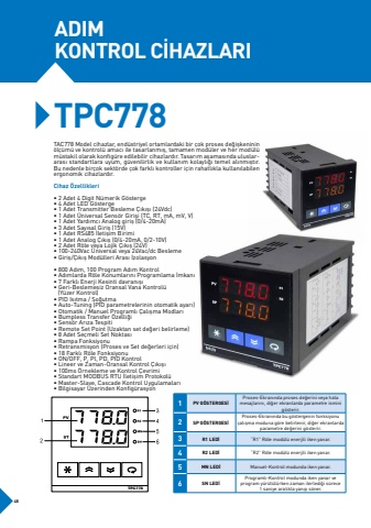 ADIMKONTROL C%u0130HAZLARITPC778 TAC778 Model cihazlar, end%u00fcstriyel ortamlardaki bir %u00e7ok proses de%u011fi%u015fkeninin %u00f6l%u00e7%u00fcm%u00fc ve kontrol%u00fc amac%u0131 ile tasarlanm%u0131%u015f, tamamen mod%u00fcler ve her mod%u00fcl%u00fc m%u00fcstakil olarak konfig%u00fcre edilebilir cihazlard%u0131r. Tasar%u0131m a%u015famas%u0131nda uluslararas%u0131 standartlara uyum, g%u00fcvenilirlik ve kullan%u0131m kolayl%u0131%u011f%u0131 temel al%u0131nm%u0131%u015ft%u0131r. Bu nedenle bir%u00e7ok sekt%u00f6rde %u00e7ok farkl%u0131 kontroller i%u00e7in rahatl%u0131kla kullan%u0131labilen ergonomik cihazlard%u0131r.Cihaz %u00d6zellikleri%u2022 2 Adet 4 Digit N%u00fcmerik G%u00f6sterge%u2022 4 Adet LED G%u00f6sterge%u2022 1 Adet Transmitter Besleme %u00c7%u0131k%u0131%u015f%u0131 (24Vdc)%u2022 1 Adet %u00dcniversal Sens%u00f6r Giri%u015fi (TC, RT, mA, mV, V)%u2022 1 Adet Yard%u0131mc%u0131 Analog giri%u015f (0/4-20mA)%u2022 3 Adet Say%u0131sal Giri%u015f (15V)%u2022 1 Adet RS485 %u0130leti%u015fim Birimi%u2022 1 Adet Analog %u00c7%u0131k%u0131%u015f (0/4-20mA, 0/2-10V)%u2022 2 Adet R%u00f6le veya Lojik %u00c7%u0131k%u0131%u015f (24V)%u2022 100-240Vac %u00dcniversal veya 24Vac/dc Besleme%u2022 Giri%u015f/%u00c7%u0131k%u0131%u015f Mod%u00fclleri Aras%u0131 %u0130zolasyon%u2022 800 Ad%u0131m, 100 Program Ad%u0131m Kontrol%u2022 Ad%u0131mlarda R%u00f6le Konumlar%u0131n%u0131 Programlama %u0130mkan%u0131%u2022 7 Farkl%u0131 Enerji Kesinti davran%u0131%u015f%u0131%u2022 Geri-Beslemesiz Oransal Vana Kontrol%u00fc (Y%u00fczer Kontrol)%u2022 PID Is%u0131tma / So%u011futma%u2022 Auto-Tuning (PID parametrelerinin otomatik ayar%u0131)%u2022 Otomatik / Manuel Programl%u0131 %u00c7al%u0131%u015fma Modlar%u0131%u2022 Bumpless Transfer %u00d6zelli%u011fi%u2022 Sens%u00f6r Ar%u0131za Tespiti%u2022 Remote Set Point (Uzaktan set de%u011feri belirleme)%u2022 8 Adet Se%u00e7meli Set Noktas%u0131%u2022 Rampa Fonksiyonu%u2022 Retransmisyon (Proses ve Set de%u011ferleri i%u00e7in)%u2022 18 Farkl%u0131 R%u00f6le Fonksiyonu%u2022 ON/OFF, P, Pl, PD, PID Kontrol%u2022 Lineer ve Zaman-Oransal Kontrol %u00c7%u0131k%u0131%u015f%u0131%u2022 100ms %u00d6rnekleme ve Kontrol %u00c7evrimi%u2022 Standart MODBUS RTU %u0130leti%u015fim Protokol%u00fc%u2022 Master-Slave, Cascade Kontrol Uygulamalar%u0131%u2022 Bilgisayar %u00dczerinden Konfig%u00fcrasyon1PV G%u00d6STERGES%u0130Proses-Ekran%u0131nda proses de%u011ferini veya hata mesajlar%u0131n%u0131, di%u011fer ekranlarda parametre ismini g%u00f6sterir.2SP G%u00d6STERGES%u0130Proses-Ekran%u0131nda bu g%u00f6stergenin fonksiyonu %u00e7al%u0131%u015fma moduna g%u00f6re belirlenir, di%u011fer ekranlarda parametre de%u011ferini g%u00f6sterir.3R1 LED%u0130%u201cR1%u201d R%u00f6le mod%u00fcl%u00fc enerjili iken yanar.4R2 LED%u0130%u201cR2%u201d R%u00f6le mod%u00fcl%u00fc enerjili iken yanar.5MN LED%u0130Manuel-Kontrol modunda iken yanar.6SN LED%u0130Programl%u0131-Kontrol modunda iken yanar veprogram y%u00fcr%u00fct%u00fcl%u00fcrken zaman ilerledi%u011fi s%u00fcreceTPC7781 saniye aral%u0131kla yan%u0131p s%u00f6ner.48
