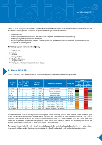 Geni%u015f s%u0131cakl%u0131k aral%u0131%u011f%u0131n%u0131 %u00f6l%u00e7ebilmeleri, sa%u011flaml%u0131klar%u0131 ve kolay kullan%u0131labilirlikleri sayesinde end%u00fcstride geni%u015f %u015fekilde kullan%u0131lan termokupllar%u0131n se%u00e7iminde a%u015fa%u011f%u0131daki kriterler g%u00f6z %u00f6n%u00fcne al%u0131nmal%u0131d%u0131r:%u2022 S%u0131cakl%u0131k aral%u0131%u011f%u0131%u2022 Termokuplun yada koruyucu k%u0131l%u0131f malzemesinin kimyasal maddelere kar%u015f%u0131 dayan%u0131kl%u0131l%u0131%u011f%u0131%u2022 A%u015f%u0131nmaya veya titre%u015fimlere olan diren%u00e7leri%u2022 Kurulum gereksinimleri (Var olan bir cihazla uyumluluk gerekebilir, var olan mekanik yap%u0131 dalma boyunu, k%u0131l%u0131f %u00e7ap%u0131n%u0131 vb. belirleyebilir)Termokupl yap%u0131sal olarak incelendi%u011finde;1- Eleman teli2- %u0130zolat%u00f6r3- Primer4- Koruyucu K%u0131l%u0131f5- Ba%u011flant%u0131 klemensi6- Ba%u011flant%u0131 kafas%u01317- Flan%u015f veya rekor gibi malzemelerden olu%u015fur.ELEMAN TELLER%u0130DIN 43710 ve IEC-584 standartlar%u0131nda end%u00fcstride en %u00e7ok kullan%u0131lan eleman telleri %u015funlard%u0131r.Eleman tellerinin s%u0131cakl%u0131k-mV e%u011frileri incelendi%u011finde lineer olmad%u0131%u011f%u0131 g%u00f6r%u00fcl%u00fcr. Her eleman telinin di%u011ferine g%u00f6re lineer olarak daha uygun oldu%u011fu b%u00f6lgeler vard%u0131r. %u00d6rne%u011fin 800%u00b0C %u00f6l%u00e7ebilen bir Fe-Const termokupl ile 1200%u00b0C %u00f6l%u00e7ebilen NiCr-Ni eleman tellerinin mV e%u011frisi kar%u015f%u0131la%u015ft%u0131r%u0131ld%u0131%u011f%u0131nda 300-500%u00b0C aras%u0131nda Fe-Const, NiCr-N%u0130%u2019e g%u00f6re daha lineer%u2019dir. Bu nedenle bu %u00e7al%u0131%u015fma aral%u0131%u011f%u0131nda Fe-Const tercih edilir. PtRh-Pt eleman teli incelendi%u011finde 800%u00b0C%u2019nin alt%u0131nda lineer de%u011fildir.800-1600%u00b0C aras%u0131 daha uygun %u00e7al%u0131%u015fma alan%u0131d%u0131r.Termokupl eleman telleri (+) ve (-) olmak %u00fczere iki bacakl%u0131d%u0131r. Bu nedenle cihaza ba%u011flan%u0131rken (+) ve (-) u%u00e7lar%u0131 dikkate al%u0131narak ba%u011flanmal%u0131d%u0131r. Uluslararas%u0131 standartlarda (+) ve (-) u%u00e7lar%u0131 belli renk kodlar%u0131 ile i%u015faretlenmi%u015ftir.www.tetcis.com.trELEMANTEL%u0130DIN43710DIN 43710veIEC 584SICAKLIKARALI%u011eI%u0130%u00c7ERD%u0130%u011e%u0130 ELEMANLARDUYARLILIKRENKLERIEC584-3D%u0130N43710+ -+ -Cu-ConstUT-200%u00b0C+300%u00b0CBak%u0131r-Konstantan-43 %u00b5V/%u00b0CFe-KonstLJ-200%u00b0C+800%u00b0CDemir-Konstantan-52 %u00b5V/%u00b0CCr-AIK-200%u00b0C+1200%u00b0CKromel-Al%u00fcmel41 %u00b5V/%u00b0CNiCr-NiK-200%u00b0C+1200%u00b0CNikelKrom-Nikel41 %u00b5V/%u00b0CCr-ConstE-200%u00b0C+1200%u00b0CKromel-Konstantan68 %u00b5V/%u00b0CNikrosil-NisilN0%u00b0C+1200%u00b0CNikelKrom-Silikon-Nikelsilikon magnezyum39 %u00b5V/%u00b0CPt%10Rh-PtS0%u00b0C+1500%u00b0CPlatin Rodyum-Platin (%10)10 %u00b5V/%u00b0CPt%13Rh-PtR0%u00b0C+1600%u00b0CPlatin Rodyum-Platin (%13)10 %u00b5V/%u00b0CPt%18Rh-PtB0%u00b0C+1800%u00b0CPlatin Rodyum-Platin (%18)Tn-Tn%26ReW0%u00b0C+2000%u00b0CTungten-Tungsten% 26 Renyum5