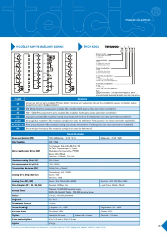Mod%u00fclA%u00e7%u0131klamaS1%u00dcniversal sens%u00f6r giri%u015f mod%u00fcl%u00fc (Proses de%u011feri %u00f6l%u00e7%u00fcm%u00fc i%u00e7in kullan%u0131lan sens%u00f6r bu mod%u00fcldeki uygun sembol%u00fcn bulundu%u011fu klemenslere ba%u011flanmal%u0131d%u0131r).S20/4-20mA Yard%u0131mc%u0131 analog giri%u015f mod%u00fcl%u00fc (Bu mod%u00fcl%u00fcn fonksiyonu cihaz %u00fczerinden se%u00e7ilebilir).S3100-1500%u2126 Potansiyometre giri%u015f mod%u00fcl%u00fc (Bu mod%u00fcl%u00fcn fonksiyonu cihaz %u00fczerinden se%u00e7ilebilir).LULojik giri%u015f mod%u00fcl%u00fc (Bu mod%u00fcl%u00fcn i%u00e7eri%u011fi %u00fcr%u00fcn kodu ile belirlenir. Fonksiyonlar%u0131 ise cihaz %u00fczerinden se%u00e7ilebilir).01,02Analog %u00c7%u0131k%u0131%u015f mod%u00fclleri (Bu mod%u00fcl%u00fcn i%u00e7eri%u011fi %u00fcr%u00fcn kodu ile belirlenir. Fonksiyonlar%u0131 ise cihaz %u00fczerinden se%u00e7ilebilir).R1, R2 R3, R4R%u00f6le %u00c7%u0131k%u0131%u015f mod%u00fclleri (Bu mod%u00fcl%u00fcn i%u00e7eri%u011fi %u00fcr%u00fcn kodu ile belirlenir. Fonksiyonlar%u0131 ise cihaz %u00fczerinden se%u00e7ilebilir). PSBesleme gerilimi giri%u015fi (Bu mod%u00fcl%u00fcn i%u00e7eri%u011fi %u00fcr%u00fcn kodu ile belirlenir).MOD%u00dcLER YAPI VE BA%u011eLANTI %u015eEMASI%u00dcR%u00dcN KODUTeknik %u00d6zelliklerBesleme Gerilimi (PS)100-240Vac/dc: +%10 -%1524Vac/dc: +%10 -%20G%u00fc%u00e7 T%u00fcketimi6W, 10VA%u00dcniversal Sens%u00f6r Giri%u015fi (S1)Termokupl: B,E,J,K,L,N,R,S,T,U%u0130ki Telli Transmitter: 4-20mARezistans Termometre: PT100Ak%u0131m: 0/4-20mAGerilim : 0-50mV, 0/2-10VYard%u0131mc%u0131 Analog Giri%u015f(S2)0/4-20mAPotansiyometre Giri%u015fi (S3)100-1500%u2126Transmitter Besleme (TX)24Vdc (Isc = 30mA) Analog Giri%u015f Empedanslar%u0131Termokupl, mV: 10M%u2126Ak%u0131m: 10%u2126 Gerilim: 1M%u2126Analog %u00c7%u0131k%u0131%u015f (01, O2)Ak%u0131m : 0/4-20mA (RL%u2264500%u2126)Gerilim : 0/2-10V (RL%u22651M%u2126)R%u00f6le %u00c7%u0131k%u0131%u015flar%u0131 (R1, R2, R3, R4)Kontak: 250Vac, 3ALojik %u00c7%u0131k%u0131%u015f: 24Vdc, 20mAKontak %u00d6mr%u00fcY%u00fcks%u00fcz: 10.000.000 anahtarlama250V, 3A Rezistif Y%u00fckte : 100.000 anahtarlamaHaf%u0131za100 y%u0131l, 100.000 yenilemeDo%u011fruluk+/- %0.2%u00d6rnekleme Zaman%u0131100msOrtam S%u0131cakl%u0131%u011f%u0131%u00c7al%u0131%u015fma: -10...+55CDepolama: -20...+65CKoruma S%u0131n%u0131f%u0131%u00d6n Panel: IP54G%u00f6vde: IP20%u00d6l%u00e7%u00fclerGeni%u015flik: 96 mmY%u00fckseklik: 96 mmDerinlik: 110 mmPano kesim %u00f6l%u00e7%u00fcleri92+/-0.5 mm x 92+/-0.5 mmA%u011f%u0131rl%u0131k430 grFirmam%u0131z, %u00f6nceden haber vermeksizin, %u00fcr%u00fcnlerinde her t%u00fcrl%u00fc de%u011fi%u015fiklik yapma hakk%u0131n%u0131 sakl%u0131 tutar.TPC99951www.tetcis.com.tr