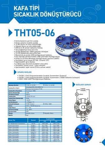 KAFA T%u0130P%u0130SICAKLIK D%u00d6N%u00dc%u015eT%u00dcR%u00dcC%u00dcTHT05-06 %u2022 Geni%u015f besleme gerilim aral%u0131%u011f%u0131%u2022 Geni%u015f %u00e7al%u0131%u015fma s%u0131cakl%u0131k aral%u0131%u011f%u0131%u2022 16 Bit %u00f6l%u00e7%u00fcm ve %u00e7%u0131k%u0131%u015f %u00e7%u00f6z%u00fcn%u00fcrl%u00fc%u011f%u00fc%u2022 Y%u00fcksek %u00f6l%u00e7%u00fcm ve %u00e7%u0131k%u0131%u015f do%u011frulu%u011fu%u2022 DIN form B sens%u00f6r kafas%u0131na montaj%u2022 Ters ba%u011flant%u0131ya kar%u015f%u0131 koruma%u2022 THT06 Modelinde 1500V galvanik izolasyon%u2022 THT05 Modelinde ekonomik fiyat%u2022 Ekonomik ve pratik USB konfig%u00fcrasyon kablosu%u2022 G%u00fc%u00e7 kayna%u011f%u0131 gerektirmeden USB %u00fczerinden konfig%u00fcrasyon%u2022 Kolay ve %u00fccretsiz Windows konfig%u00fcrasyon yaz%u0131l%u0131m%u0131 CoNi01%u2022 Se%u00e7ilebilir giri%u015f sinyali (PT100, 10 farkl%u0131 T/C)%u2022 Ayarlanabilir giri%u015f skalas%u0131%u2022 4-20mA veya 20-4mA se%u00e7ilebilir %u00e7%u0131k%u0131%u015f y%u00f6n%u00fc%u2022 Se%u00e7ilebilir sens%u00f6r ar%u0131za - %u00e7%u0131k%u0131%u015f%u0131 seviyesi.%u2022 Ayarlanabilir tepki s%u00fcresi (Filtre zaman sabiti)S%u0130PAR%u0130%u015e VER%u0130LER%u0130%u2022 THT05: 2 Telli Programlanabilir S%u0131cakl%u0131k Transmitteri (%u0130zolesiz)%u2022 THT06: 2 Telli Programlanabilir S%u0131cakl%u0131k Transmitteri (1500V Galvanik %u0130zolasyon)%u2022 CA02: USB-UART Konfig%u00fcrasyon KablosuSensor TipiStandartS%u0131cakl%u0131k Aral%u0131%u011f%u0131(%u00b0C) (%u00b0F)Pt-100 Rezistans TermometreIEC751-200 to 840-328 to 1544Type-B TermokuplIEC584-160 to 1820140 to 3308Type-E TermokuplIEC584-1-200 to 840-328 to 1544Type-J TermokuplIEC584-1-200 to 1120-328 to 1562Type-K TermokuplIEC584-1-200 to 1360-328 to 2480Type-L TermokuplDIN43710-200 to 900-328 to 1652Type-N TermokuplIEC584-1-200 to 1300-328 to 2372Type-R TermokuplIEC584-%u00cd-40 to 1760104 to 3200Type-S TermokuplIEC584-1-40 to 1760104 to 3200Type-T TermokuplIEC584-1-200 to 400-328 to 752Type-U TermokuplDIN43710-200 to 600-328 to 1112Teknik %u00d6zelliklerBesleme GerilimiTHT05: 8...36 VDCTHT06: 10...36 VDCAnalog Giri%u015f TipleriTermokupl: B,E,J,K,L,N,R,S,T,URezistans Termometre: PT100Analog Giri%u015f Empedans%u0131Termokupl: 10M%u2126%u00d6l%u00e7%u00fcm %u00c7%u00f6z%u00fcn%u00fcrl%u00fc%u011f%u00fc16 Bit%u00d6rnekleme S%u0131kl%u0131%u011f%u0131100 msAnalog %u00c7%u0131k%u0131%u015f4-20mA, 20-4mAAnalog %u00c7%u0131k%u0131%u015f %u00c7%u00f6z%u00fcn%u00fcrl%u00fc%u011f%u00fc16 Bit%u0130letim Hatas%u0131< %u00b10,2%Is%u0131l S%u00fcr%u00fcklenme< %u00b1100ppm / %u00b0CGalvanik %u0130zolasyonTHT05: %u0130zolesizTHT06: 1500VHaf%u0131za100 Y%u0131l, 100.000 YenilenmeTepki S%u00fcresi0,2...120s%u00c7al%u0131%u015fma S%u0131cakl%u0131%u011f%u0131-40...+85%u00b0CKoruma S%u0131n%u0131f%u0131IP00%u00d6l%u00e7%u00fclerGeni%u015flik: 44mmY%u00fckseklik: 20mmA%u011f%u0131rl%u0131k40gr55BA%u011eLANTI %u015eEMASI