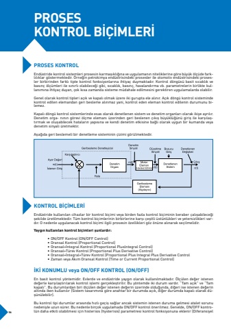 PROSES KONTROLEnd%u00fcstride kontrol sistemleri prosesin karma%u015f%u0131kl%u0131%u011f%u0131na ve uygulaman%u0131n niteliklerine g%u00f6re b%u00fcy%u00fck %u00f6l%u00e7%u00fcde farkl%u0131l%u0131klar g%u00f6stermektedir. %u00d6rne%u011fin petrokimya end%u00fcstrisindeki prosesler ile otomotiv end%u00fcstrisindeki prosesler birbirinden farkl%u0131 tipte kontrol fonksiyonlar%u0131na ihtiya%u00e7 duymaktad%u0131r. Kontrol d%u00f6ng%u00fcs%u00fc basit s%u0131cakl%u0131k ve bas%u0131n%u00e7 %u00f6l%u00e7%u00fcmleri ile s%u0131n%u0131rl%u0131 olabilece%u011fi gibi, s%u0131cakl%u0131k, bas%u0131n%u00e7, havaland%u0131rma vb. parametrelerin birlikte kullan%u0131m%u0131na ihtiya%u00e7 duyan, %u00e7ok k%u0131sa zamanda sisteme m%u00fcdahale edilmesini gerektiren uygulamalarda olabilir.Genel olarak kontrol tipleri a%u00e7%u0131k ve kapal%u0131 olmak %u00fczere iki gurupta ele al%u0131n%u0131r. A%u00e7%u0131k d%u00f6ng%u00fc kontrol sisteminde kontrol edilen elemandan geri besleme al%u0131nmaz yani, kontrol eden eleman kontrol edilenin durumunu bilemez.Kapal%u0131 d%u00f6ng%u00fc kontrol sistemlerinde esas olarak denetlenen sistem ve denetim organlar%u0131 olarak ikiye ayr%u0131l%u0131r. Denetim orga- n%u0131n%u0131n g%u00f6revi %u00f6l%u00e7me eleman%u0131 %u00fczerinden geri beslenen %u00e7%u0131k%u0131%u015f b%u00fcy%u00fckl%u00fc%u011f%u00fcn%u00fc giri%u015f ile kar%u015f%u0131la%u015f,t%u0131rmak ve olu%u015fabilecek hatalar%u0131n yap%u0131s%u0131na ve kendi denetim etkisine ba%u011fl%u0131 olarak uygun bir kumanda veya denetim sinyali %u00fcretmektir.A%u015fa%u011f%u0131da geri beslemeli bir denetleme sisteminin %u00e7izimi g%u00f6r%u00fclmektedir.KONTROL B%u0130%u00c7%u0130MLER%u0130End%u00fcstride kullan%u0131lan cihazlar bir kontrol bi%u00e7imi veya birden fazla kontrol bi%u00e7iminin beraber %u00e7al%u0131%u015fabilece%u011fi %u015fekilde %u00fcretilmektedir. T%u00fcm kontrol bi%u00e7imlerinin birbirlerine kar%u015f%u0131 %u00e7e%u015fitli %u00fcst%u00fcnl%u00fckleri ve yetersizlikleri vard%u0131r. O nedenle uygulanacak kontrol bi%u00e7imi ilgili prosesin %u00f6zellikleri g%u00f6z %u00f6n%u00fcne al%u0131narak se%u00e7ilmelidir.Yayg%u0131n kullan%u0131lan kontrol bi%u00e7imleri %u015funlard%u0131r:%u2022 ON/OFF Kontrol (ON/OFF Control)%u2022 Oransal Kontrol (Proportional Control)%u2022 Oransal+%u0130ntegral Kontrol (Proportional Pluslntegral Control)%u2022 Oransal+T%u00fcrev Kontrol (Proportional Plus Derivative Control)%u2022 Oransal+%u0130ntegral+T%u00fcrev Kontrol (Proportional Plus Integral Plus Derivative Control%u2022 Zaman veya Ak%u0131m Oransal Kontrol (Time or Current Proportional Control)%u0130K%u0130 KONUMLU veya ON/OFF KONTROL (ON/OFF)En basit kontrol y%u00f6ntemidir. Evlerde ve end%u00fcstride yayg%u0131n olarak kullan%u0131lmaktad%u0131r. %u00d6l%u00e7%u00fclen de%u011fer istenen de%u011ferle kar%u015f%u0131la%u015ft%u0131r%u0131larak kontrol i%u015flemi ger%u00e7ekle%u015ftirilir. Bu y%u00f6ntemde iki durum vard%u0131r. %u201cTam a%u00e7%u0131k%u201d ve %u201cTam kapal%u0131%u201d. Bu durumlardan biri %u00f6l%u00e7%u00fclen de%u011fer istenen de%u011ferin %u00fczerinde oldu%u011funda, di%u011feri ise istenen de%u011ferin alt%u0131nda iken kullan%u0131l%u0131r (Sistem tasar%u0131m%u0131na g%u00f6re anahtar bir durumda a%u00e7%u0131k, di%u011fer durumda kapal%u0131 olarak d%u00fc%u015f%u00fcn%u00fclebilir).Bu kontrol tipi durumlar aras%u0131nda h%u0131zl%u0131 ge%u00e7i%u015f sa%u011flar ancak sistemin istenen duruma gelmesi atalet sorunu nedeniyle uzun s%u00fcrer. Bu nedenle bir%u00e7ok uygulamada ON/OFF kontrol %u00f6nerilmez. Genelde, ON/OFF kontrol%u00fcn daha etkili olabilmesi i%u00e7in histerisis (hysterisis) parametresi kontrol fonksiyonuna eklenir (Diferansiyel PROSESKONTROL B%u0130%u00c7%u0130MLER%u013056