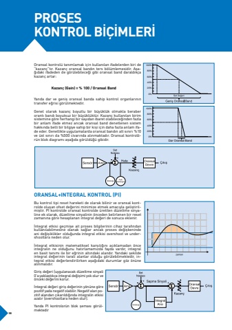 ORANSAL+INTEGRAL KONTROL (PI)Bu kontrol tipi reset hareketi de olarak bilinir ve oransal kontrolde olu%u015fan ofset de%u011ferini minimize etmek amac%u0131yla geli%u015ftirilmi%u015ftir. PI kontrolde oransal kontrolde %u00fcretilen d%u00fczeltme sinyaline ek olarak, d%u00fczeltme sinyalinin %u00f6nceden belirlenen bir reset zaman%u0131na g%u00f6re hesaplanan integral de%u011feri de sonuca eklenir.%u0130ntegral etkisi ge%u00e7mi%u015fe ait proses bilgilerinin cihaz taraf%u0131ndan kullan%u0131labilmesine olanak sa%u011flar ancak proses de%u011fi%u015fkeninde ani de%u011fi%u015fiklikler oldu%u011funda integral etkisi overshoot ve undershootlara neden olur.%u0130ntegral etkisinin matematiksel kar%u015f%u0131l%u0131%u011f%u0131n%u0131 a%u00e7%u0131klamadan %u00f6nce integralin ne oldu%u011funu hat%u0131rlamam%u0131zda fayda vard%u0131r, integral en basit tan%u0131m%u0131 ile bir e%u011frinin alt%u0131ndaki aland%u0131r. Yandaki %u015fekilde integral de%u011ferinin taral%u0131 alanlar oldu%u011fu g%u00f6r%u00fclebilmektedir, integral etkisi de%u011ferlendirilirken a%u015fa%u011f%u0131daki durumlar g%u00f6z %u00f6n%u00fcne al%u0131nmal%u0131d%u0131r.Giri%u015f de%u011feri (uygulanacak d%u00fczeltme sinyali 0%u2019a yakla%u015ft%u0131k%u00e7a integral de%u011fi%u015fimi yok olur ve %u00f6nceki de%u011ferini korur.%u0130ntegral de%u011feri giri%u015f de%u011ferinin y%u00f6n%u00fcne g%u00f6re pozitif yada negatif olabilir. Negatif alan pozitif alandan %u00e7%u0131kar%u0131ld%u0131%u011f%u0131nda integralin etkisi azal%u0131r (overshootlara neden olur).Yanda PI kontrolor%u00fcn blok %u015femas%u0131 g%u00f6r%u00fcl-mektedirOransal kontrol%u00fc tan%u0131mlamak i%u00e7in kullan%u0131lan ifadelerden biri de %u201ckazan%u00e7%u201dt%u0131r. Kazan%u00e7 oransal band%u0131n ters b%u00f6l%u00fcmlemesidir. A%u015fa%u011f%u0131daki ifadeden de g%u00f6r%u00fclebilece%u011fi gibi oransal band darald%u0131k%u00e7a kazan%u00e7 artar: Kazan%u00e7 (Gain) = % 100 / Oransal BandYanda dar ve geni%u015f oransal banda sahip kontrol organlar%u0131n%u0131n transfer e%u011frisi g%u00f6r%u00fclmektedir.Genel olarak kazan%u00e7 boyutlu bir b%u00fcy%u00fckl%u00fck olmakla beraber orant%u0131 band%u0131 boyutsuz bir b%u00fcy%u00fckl%u00fckt%u00fcr. Kazan%u00e7 kullan%u0131lan birim sistemine g%u00f6re herhangi bir say%u0131dan ibaret olabilece%u011finden fazla bir anlam ifade etmez ancak oransal band denetlenen sistem hakk%u0131nda belli bir bilgiye sahip bir ki%u015fi i%u00e7in daha fazla anlam ifade eder. Genellikle uygulamalarda oransal band%u0131n alt s%u0131n%u0131r%u0131 %10 ve %u00fcst s%u0131n%u0131r%u0131 da %500 civar%u0131nda al%u0131nmaktad%u0131r. Oransal kontrol%u00f6r%u00fcn blok diagram%u0131 a%u015fa%u011f%u0131da g%u00f6r%u00fcld%u00fc%u011f%u00fc gibidir.PROSESKONTROL B%u0130%u00c7%u0130MLER%u0130100%80%60%40%20%0%100%80%60%40%20%0%Dar Oransal Band58