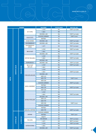 PROSESMALZEMETETC%u0130S KODUMAX.%u00c7AL.SIC.METALDEM%u0130R VE %u00c7EL%u0130KY%u00dcKSEK FIRINALT %u00c7IKI%u015e1.4749M41200%u00b0C%u2019ye kadar1.4841M5INCONEL-600M61250%u00b0C%u2019ye kadarOCAK %u00dcST%u00dcS%u0130L%u0130KON CARBIDES51200%u00b0C %u00fczeriREFRAXS6SICAK G%u00d6VDEINCONEL-600M61250%u00b0C%u2019ye kadarCEHENNEML%u0130KINCONEL-600M61250%u00b0C%u2019ye kadarCEHENNEML%u0130K %u00c7IKI%u015eI1.4571M3700%u00b0C%u2019ye kadarBACA GAZI1.4749M41200%u00b0C%u2019ye kadar1.4841M5INCONEL-600M61250%u00b0C%u2019ye kadarK%u00dcT%u00dcK TAVLAMA1.4749M41.4841M51200%u00b0C%u2019ye kadarINCONEL-600M6DURDURUCUINCONEL-600M61250%u00b0C%u2019ye kadarBACA GAZIBOYLER1.4749M41200%u00b0C%u2019ye kadar1.4841M5FIRIN B%u00d6LMELER%u01301.4749M41.4841M51200%u00b0C%u2019ye kadarINCONEL-600M6KER-610S1KER-799S21200%u00b0C %u00fczeriKER-530S3%u015eEK%u0130LLEND%u0130RMES%u0130L%u0130KON CARBIDES51500%u00b0C%u2019ye kadarREFRAXS6KER-799S21600%u00b0C%u2019ye kadarKER-530S3ISITMA POTALARI1.4749M41.4841M51200%u00b0C%u2019ye kadarINCONEL-600M6KER-610S1KER-799S2KER-530S31200%u00b0C %u00fczeriS%u0130L%u0130KON CARBIDES5REFRAXS6VAKUMLU ER%u0130TMEKER-799S21600%u00b0C%u2019ye kadarA METALLERAL%u00dcM%u0130NYUMER%u0130TMES%u0130L%u0130KON CARBIDES5REFRAXS6700%u00b0C %u00fczeriGRAF%u0130TS7TAVLAMAP%u0130K D%u00d6K%u00dcMM9700%u00b0C%u2019ye kadar1.4571M3800%u00b0C%u2019ye kadarK%u00dcT%u00dcK ISITMA1.4749M41200%u00b0C%u2019ye kadar1.4841M5INCONEL-600M61250%u00b0C%u2019ye kadar63www.tetcis.com.tr