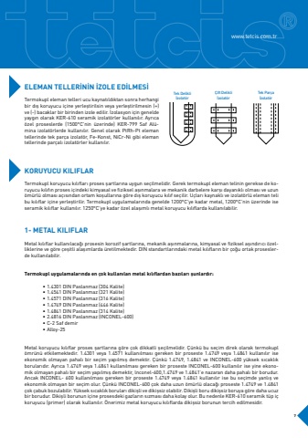ELEMAN TELLER%u0130N%u0130N %u0130ZOLE ED%u0130LMES%u0130Termokupl eleman telleri ucu kaynat%u0131ld%u0131ktan sonra herhangi bir d%u0131%u015f koruyucu i%u00e7ine yerle%u015ftirilsin veya yerle%u015ftirilmesin (+) ve (-) bacaklar bir birinden izole edilir. %u0130zolasyon i%u00e7in genelde yayg%u0131n olarak KER-610 seramik izolat%u00f6rler kullan%u0131l%u0131r. Ayr%u0131ca %u00f6zel proseslerde (1500%u00b0C%u2019nin %u00fczerinde) KER-799 Saf Al%u00fcmina izolat%u00f6rlerde kullan%u0131l%u0131r. Genel olarak PtRh-Pt eleman tellerinde tek par%u00e7a izolat%u00f6r, Fe-Konst, NiCr-Ni gibi eleman tellerinde par%u00e7al%u0131 izolat%u00f6rler kullan%u0131l%u0131r.KORUYUCU KILIFLARTermokupl koruyucu k%u0131l%u0131flar%u0131 proses %u015fartlar%u0131na uygun se%u00e7ilmelidir. Gerek termokupl eleman telinin gerekse de koruyucu k%u0131l%u0131f%u0131n proses i%u00e7indeki kimyasal ve fiziksel a%u015f%u0131nmalara ve mekanik darbelere kar%u015f%u0131 dayan%u0131kl%u0131 olmas%u0131 ve uzun %u00f6m%u00fcrl%u00fc olmas%u0131 a%u00e7%u0131s%u0131ndan ortam ko%u015fullar%u0131na g%u00f6re d%u0131%u015f koruyucu k%u0131l%u0131f se%u00e7ilir. U%u00e7lar%u0131 kaynakl%u0131 ve izolat%u00f6rl%u00fc eleman teli bu k%u0131l%u0131flar i%u00e7ine yerle%u015ftirilir. Termokupl uygulamalar%u0131nda genelde 1200%u00b0C%u2019ye kadar metal, 1200%u00b0C%u2019nin %u00fczerinde ise seramik k%u0131l%u0131flar kullan%u0131l%u0131r. 1250%u00b0C%u2019ye kadar %u00f6zel ala%u015f%u0131ml%u0131 metal koruyucu k%u0131l%u0131flarda kullan%u0131labilir.1- METAL KILIFLARMetal k%u0131l%u0131flar kullan%u0131laca%u011f%u0131 prosesin korozif %u015fartlar%u0131na, mekanik a%u015f%u0131nmalar%u0131na, kimyasal ve fiziksel a%u015f%u0131nd%u0131r%u0131c%u0131 %u00f6zelliklerine ve g%u00f6re %u00e7e%u015fitli ala%u015f%u0131mlarda %u00fcretilmektedir. DIN standartlar%u0131ndaki metal k%u0131l%u0131flar%u0131n bir %u00e7o%u011fu ortak proseslerde kullan%u0131labilir.Termokupl uygulamalar%u0131nda en %u00e7ok kullan%u0131lan metal k%u0131l%u0131flardan baz%u0131lar%u0131 %u015funlard%u0131r:%u2022 1.4301 DIN Paslanmaz (304 Kalite)%u2022 1.4541 DIN Paslanmaz (321 Kalite)%u2022 1.4571 DIN Paslanmaz (316 Kalite)%u2022 1.4749 DIN Paslanmaz (446 Kalite)%u2022 1.4841 DIN Paslanmaz (314 Kalite)%u2022 2.4816 DIN Paslanmaz (INCONEL-600)%u2022 C-2 Saf demir%u2022 Alloy-25Metal koruyucu k%u0131l%u0131flar proses %u015fartlar%u0131na g%u00f6re %u00e7ok dikkatli %u015fe%u00e7ilmelidir. %u00c7%u00fcnk%u00fc bu se%u00e7im direk olarak termokupl %u00f6mr%u00fcn%u00fc etkilemektedir. 1.4301 veya 1.4571 kullan%u0131lmas%u0131 gereken bir proseste 1.4749 veya 1.4841 kullan%u0131l%u0131r ise ekonomik olmayan pahal%u0131 bir se%u00e7im yap%u0131lm%u0131%u015f demektir. %u00c7%u00fcnk%u00fc 1.4749, 1.4841 ve INCONEL-600 y%u00fcksek s%u0131cakl%u0131k borular%u0131d%u0131r. Ayr%u0131ca 1.4749 veya 1.4841 kullan%u0131lmas%u0131 gereken bir proseste INCONEL-600 kullan%u0131l%u0131r ise yine ekonomik olmayan pahal%u0131 bir se%u00e7im yap%u0131lm%u0131%u015f demektir, lnconel-600,1.4749 ve 1.4841%u2019e nazaran daha pahal%u0131 bir borudur. Ancak INCONEL- 600 kullan%u0131lmas%u0131 gereken bir proseste 1.4749 veya 1.4841 kullan%u0131l%u0131r ise bu se%u00e7imde yanl%u0131%u015f ve ekonomik olmayan bir se%u00e7im olur. %u00c7%u00fcnk%u00fc INCONEL-600 %u00e7ok daha uzun %u00f6m%u00fcrl%u00fc olaca%u011f%u0131 proseste 1.4749 ve 1.4841 %u00e7ok %u00e7abuk bozulabilir. Y%u00fcksek s%u0131cakl%u0131k borular%u0131 diki%u015fli ve diki%u015fsiz olabilir. Diki%u015fli boru diki%u015fsiz boruya g%u00f6re daha ucuz bir borudur. Diki%u015fli borunun i%u00e7ine prosesdeki gazlar%u0131n s%u0131zmas%u0131 daha kolay olur. Bu nedenle KER-610 seramik t%u00fcp i%u00e7 koruyucu (primer) olarak kullan%u0131l%u0131r. %u00d6nerimiz metal koruyucu k%u0131l%u0131flarda diki%u015fsiz borunun tercih edilmesidir.Tek Delikli%u0130zolat%u00f6r%u00c7ift Delikli%u0130zolat%u00f6rTek Par%u00e7a%u0130zolat%u00f6r7www.tetcis.com.tr