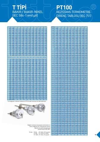 T T%u0130P%u0130BAKIR / BAKIR-N%u0130KEL(IEC 584-1 emf %u00b5V)PT100REZ%u0130STANS TERMOMETRED%u0130REN%u00c7 TABLOSU (IEC 751)* mV de%u011ferleri referans noktas%u0131n%u0131n 0%u00b0C%u2019de sabit tutulmas%u0131 ile elde edilmi%u015ftir.De%u011fi%u015fik rezistans termometre elemanlar%u0131n%u0131ndiren%u00e7 de%u011ferleri PT-100 eleman%u0131n diren%u00e7de%u011frelerinin belli katsay%u0131lar%u0131yla%u00e7arp%u0131lmas%u0131yla elde edilir.%u00d6rnek;Pt-50= Pt-100 x 1/2%u2019ye e%u015fittir.Pt-500= Pt-100 x 5%u2019e e%u015fittir. Pt-1000= Pt-100 x 10%u2019a e%u015fittir.0C0-1-2-3-4-5-6-7-8-9-10-2706.258-2606.2326.2366.2396.2426.2456.2486.2516.2536.2556.2566.258-2506.1806.1876.1936.1986.2046.2096.2146.2196.2236.2286.232-2406.1056.1146.1226.1306.1386.1466.1536.1606.1676.1746.180-2306.0076.0176.0286.0386.0496.0596.0686.0786.0876.0966.105-2205.8885.9015.9145.9265.9385.9505.9625.9735.9855.9966.007-210-5.753-5.767-5.782-5.795-5.809-5.823-5.836-5.850-5.863-5.876-5.888-200-5.603-5.619-5.634-5.650-5.665-5.680-5.695-5.710-5.724-5.739-5.753-190-5.439-5.456-5.473-5.489-5.506-5.523-5.539-5.555-5.571-5.587-5.603-180-5.261-5.279-5.297-5.316-5.334-5.351-5.369-5.387-5.404-5.421-5.439-1705.0705.0895.1095.1285.1485.1675.1865.2055.2245.2425.261-1604.8654.8864.9074.9284.9494.9694.9895.0105.0305.0505.070-1504.6484.6714.6934.7154.7374.7594.7804.8024.8234.8444.865-1404.4194.4434.4664.4894.5124.5354.5584.5814.6044.6264.648-1304.1774.2024.2264.2514.2754.3004.3244.3484.3724.3954.419-1203.9233.9493.9754.0004.0264.0524.0774.1024.1274.1524.177-1103.6573.6843.7113.7383.7653.7913.8183.8443.8713.8973.923-100-3.379-3.407-3.435-3.463-3.491-3.519-3.547-3.5743.6023.6293.657-90-3.089-3.118-3.148-3.177-3.206-3.235-3.264-3.293-3.322-3.350-3.379-80-2.788-2.818-2.849-2.879-2.910-2.940-2.970-3.000-3.030-3.059-3.089-70-2.476-2.507-2.539-2.571-2.602-2.633-2.664-2.695-2.726-2.757-2.788-602.1532.1862.2182.2512.2832.3162.3482.3802.4122.4442.476-501.8191.8531.8871.9201.9541.9872.0212.0542.0872.1202.153-401.4751.5101.5451.5791.6141.6481.6831.7171.7511.7851.819-301.1211.1571.1921.2281.2641.2991.3351.3701.4051.4401.475-200.7570.7940.8300.8670.9040.9400.9761.0131.0491.0851.121-100.3830.4210.4590.4960.5340.5710.6080.6460.6830.7200.75700.0000.0390.0770.1160.1540.1930.2310.2690.3070.3450.3830C01234567891000.0000.0390.0780.1170.1560.1950.2340.2730.3120.3520.391100.3910.4310.4700.5100.5490.5890.6290.6690.7090.7490.790200.7900.8300.8700.9110.9510.9921.0331.0741.1141.1551.196301.1961.2381.2791.3201.3621.4031.4451.4861.5281.5701.612401.6121.6541.6961.7381.7801.8231.8651.9081.9501.9932.036502.0362.0792.1222.1652.2082.2512.2942.3382.3812.4252.468602.4682.5122.5562.6002.6432.6872.7322.7762.8202.8642.909702.9092.9532.9983.0433.0873.1323.1773.2223.2673.3123.358803.3583.4033.4483.4943.5393.5853.6313.6773.7223.7683.814903.8143.8603.9073.9533.9994.0464.0924.1384.1854.2324.2791004.2794.3254.3724.4194.4664.5134.5614.6084.6554.7024.7501104.7504.7984.8454.8934.9414.9885.0365.0845.1325.1805.2281205.2285.2775.3255.3735.4225.4705.5195.5675.6165.6655.7141305.7145.7635.8125.8615.9105.9596.0086.0576.1076.1566.2061406.2066.2556.3056.3556.4046.4546.5046.5546.6046.6546.7041506.7046.7546.8056.8556.9056.9567.0067.0577.1077.1587.2091607.2097.2607.3107.3617.4127.4637.5157.5667.6177.6687.7201707.7207.7717.8237.8747.9267.9778.0298.0818.1338.1858.2371808.2378.2898.3418.3938.4458.4978.5508.6028.6548.7078.7591908.7598.8128.8658.9178.9709.0239.0769.1299.1829.2359.2882009.2889.3419.3959.4489.5019.5559.6089.6629.7159.7699.8222109.8229.8769.9309.98410.03810.09210.14610.20010.25410.30810.36222010.36210.41710.47110.52510.58010.63410.68910.74310.79810.85310.90723010.90710.96211.01711.07211.12711.18211.23711.29211.34711.40311.45824011.45811.51311.56911.62411.68011.73511.79111.84611.90211.95812.01325012.01312.06912.12512.18112.23712.29312.34912.40512.46112.51812.57426012.57412.63012.68712.74312.79912.85612.91212.96913.02613.08213.13927013.13913.19613.25313.31013.36613.42313.48013.53713.59513.65213.70928013.70913.76613.82313.88113.93813.99514.05314.11014.16814.22614.28329014.28314.34114.39914.45614.51414.57214.63014.68814.74614.80414.86230014.86214.92014.97815.03615.09515.15315.21115.27015.32815.38615.44531015.44515.50315.56215.62115.67915.73815.79715.85615.91415.97316.03232016.03216.09116.15016.20916.26816.32716.38716.44616.50516.56416.62433016.62416.68316.74216.80216.86116.92116.98017.04017.10017.15917.21934017.21917.27917.33917.39917.45817.51817.57817.63817.69817.75917.81935017.81917.87917.93917.99918.06018.12018.18018.24118.30118.36218.42236018.42218.48318.54318.60418.66518.72518.78618.84718.90818.96919.03037019.03019.09119.15219.21319.27419.33519.39619.45719.51819.57919.64138019.64119.70219.76319.82519.88619.94720.00920.07020.13220.19320.25539020.25520.31720.37820.44020.50220.56320.62520.68720.74820.81020.87240020.872C(t90)0123456789-20018.52-19022.8322.4021.9721.5421.1120.6820.2519.8219.3818.95-18027.1026.6726.2425.8225.3924.9724.5424.1123.6823.25-17031.3430.9130.4930.0729.6429.2228.8028.3727.9527.52-16035.5435.1234.7034.2833 8633.4433.0232.6032.1831.76-15039.7239.3138.8938.4738.0537.6437.2236.8036.3835.96-14043.8843.4643.0542.6342.2241.8041.3940.9740.5640.14-13048.0047.5947.1846.7746.3645.9445.5345.1244.7044.29-12052.1151.7051.2950.8850.4750.0649.6549.2448.8348.42-11056.1955.7955.3854.9754.5654.1553.7553.3452.9352.52-10060.2659.8559.4459.0458.6358.2357.8257.4157.0156.60-9064.3063.9063.4963.0962.6862.2861.8861.4761.0760.66-8068.3367.9267.5267.1266.7266.3165.9165.5165.1164.70-7072.3371.9371.5371.1370.7370.3369.9369.5369.1368.73-6076.3375.9375.5375.1374.7374.3373.9373.5373.1372.73-5080.3179.9179.5179.1178.7278.3277.9277.5277.1276.73-4084.2783.8783.4883.0882.6982.2981.8981.5081.1080.70-3088.2287.8387.4387.0486.6486.2585.8585.4685.0684.67-2092.1691.7791.3790.9890.5990.1989.8089.4089.0188 62-1096.0995.6995.3094.9194.5294.1293.7393.3492.9592.550100.0099.6199.2298.8398 4498.0497.6597.2696.8796.480100.00100.39100.78101.17101.56101.95102.34102.73103.12103.5110103.90104.29104.68105.07