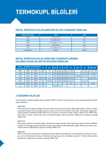 METAL KORUYUCU KILIFLARIN DIN VE AISI STANDART KODLARIMETAL KORUYUCU KILIFLARIN DIN STANDARTLARINDA%u00c7ALI%u015eMA SICAKLIKLARI VE B%u0130LE%u015e%u0130M ORANLARI2-SERAM%u0130K KILIFLARTermokupllar%u0131n kullan%u0131laca%u011f%u0131 proses s%u0131cakl%u0131%u011f%u0131 1200%u00b0C ve %u00fczeri ise d%u0131%u015f koruyucu k%u0131l%u0131f olarak genelde seramik t%u00fcpler kullan%u0131l%u0131r.KER-530:G%u00f6zenekli (poroz) yap%u0131ya sahiptir. Bu yap%u0131s%u0131ndan dolay%u0131 termal %u015foklara daha dayan%u0131kl%u0131d%u0131r. Gazlar%u0131n yo%u011fun proseslerde gaz s%u0131zma olas%u0131l%u0131%u011f%u0131na kar%u015f%u0131 i%u00e7 koyuculu (Primerli) olarak imal edilir. Termokupl uygulama,s%u0131nda standart %u00fcretimlerimizde KER-610 i%u00e7 koruyucu seramikli olarak %u00fcretilir. KER-610 ve KER-799%u2019a g%u00f6re daha ucuzdur. Termal %u015fok olan proseslerde yo%u011fun olarak kullan%u0131l%u0131r. Maksimum %u00e7al%u0131%u015fma s%u0131cakl%u0131%u011f%u0131 1600%u00b0C%u2019dir.KER-610:%u00d6zel yap%u0131ya sahip bir seramik t%u00fcpd%u00fcr. G%u00f6zeneksiz yap%u0131ya sahiptir. Bu nedenle gaz ge%u00e7irmez bir %u00f6zelli%u011fine sahiptir. Termokupl uygulamalar%u0131nda d%u0131%u015f koruyucu olarak kullan%u0131ld%u0131%u011f%u0131 gibi yo%u011fun olarak i%u00e7 koruyucu olarakta kullan%u0131l%u0131r. Maksimum %u00e7al%u0131%u015fma s%u0131cakl%u0131%u011f%u0131 1500%u00b0C%u2019dir.KER-799:%99,97 oran%u0131nda saf al%u00fcmina i%u00e7erdi%u011finden dolay%u0131 di%u011fer seramiklerden %u00e7ok kalitelidir. Seramik h%u00fccre ya,p%u0131s%u0131 %u00e7ok s%u0131k olmas%u0131ndan dolay%u0131 m%u00fckemmel bir gaz ge%u00e7irmez %u00f6zelli%u011fine sahiptir. Termal %u015foklara daha dayan%u0131kl%u0131d%u0131r. Maksimum %u00e7al%u0131%u015fma s%u0131cakl%u0131%u011f%u0131 1800%u00b0C%u2019dir.METAL KILIF C%u0130NS%u0130DINAISI1.4301X 5 CrNi 18 103041.4541X 6 CrN%u0130Ti 18 113211.4571X 6 CrNiMoTi 17 12 2316 Ti 1.4749x18 CrN 28446-11.4841X 15 CrNISi 25 20314lnconel-6002.4816B 166METAL KILIF C%u0130NS%u0130S%u00dcREKL%u0130 %u00c7AL. SIC.MAX%u0130MUM%u00c7AL. SIC.C%Si%Mn%P%S%Cr%Mo%NiD%u0130%u011eERLER%u01301.4301900%u00b0C1000%u00b0C%u22640,071,02,000,0450,03017,0-20,0-8,5-10,5Al 1,20-1,701.4541900%u00b0C1000%u00b0C%u22640,11,02,000,0450,03017,0-19,0-9,0-11,5Ti %u2265 5x%C1.4571900%u00b0C1000%u00b0C%u22640,11,02,000,0450,03016,5-18,52,00-2,5010,5-13,5Ti %u2265 5x%C1.47491100%u00b0C1200%u00b0C0,15-20%u22641,0%u22641,00,0450,03026,0-29,0--N 0,15-0,251.48411000%u00b0C1150%u00b0C0,201,50-2,502,000,0450,03024,0-26,019,0-21,0lnconel-6001180%u00b0C1250%u00b0C0,0515,575Fe 8,0C-2950%u00b0C1000%u00b0C0,030.0300,01TERMOKUPL B%u0130LG%u0130LER%u01308